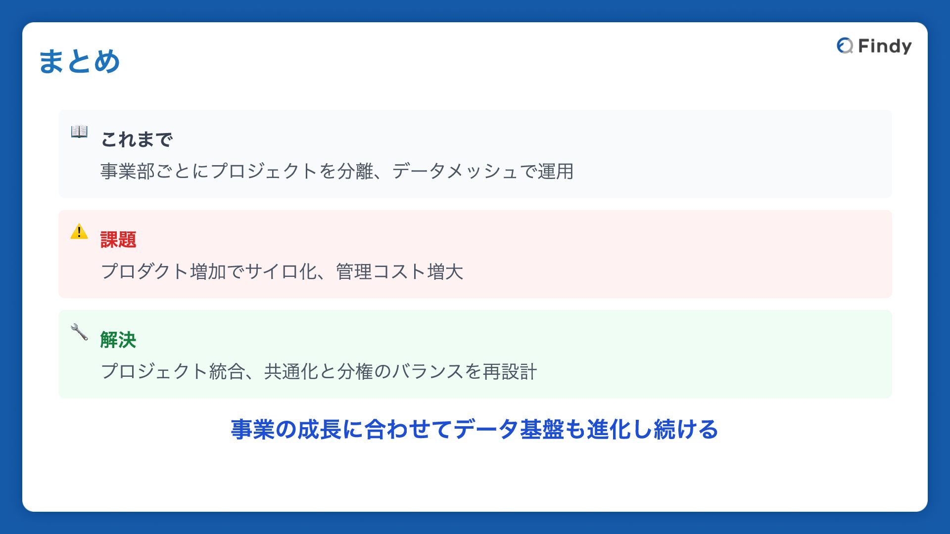 📖 これまで 事業部ごとにプロジェクトを分離、データメッシュで運用 ⚠️ 課題 プロダクト増加でサイロ化、管理コスト増大 🔧 解決 プロジェクト統合、共通化と分権のバランスを再設計 事業の成長に合わせてデータ基盤も進化し続ける