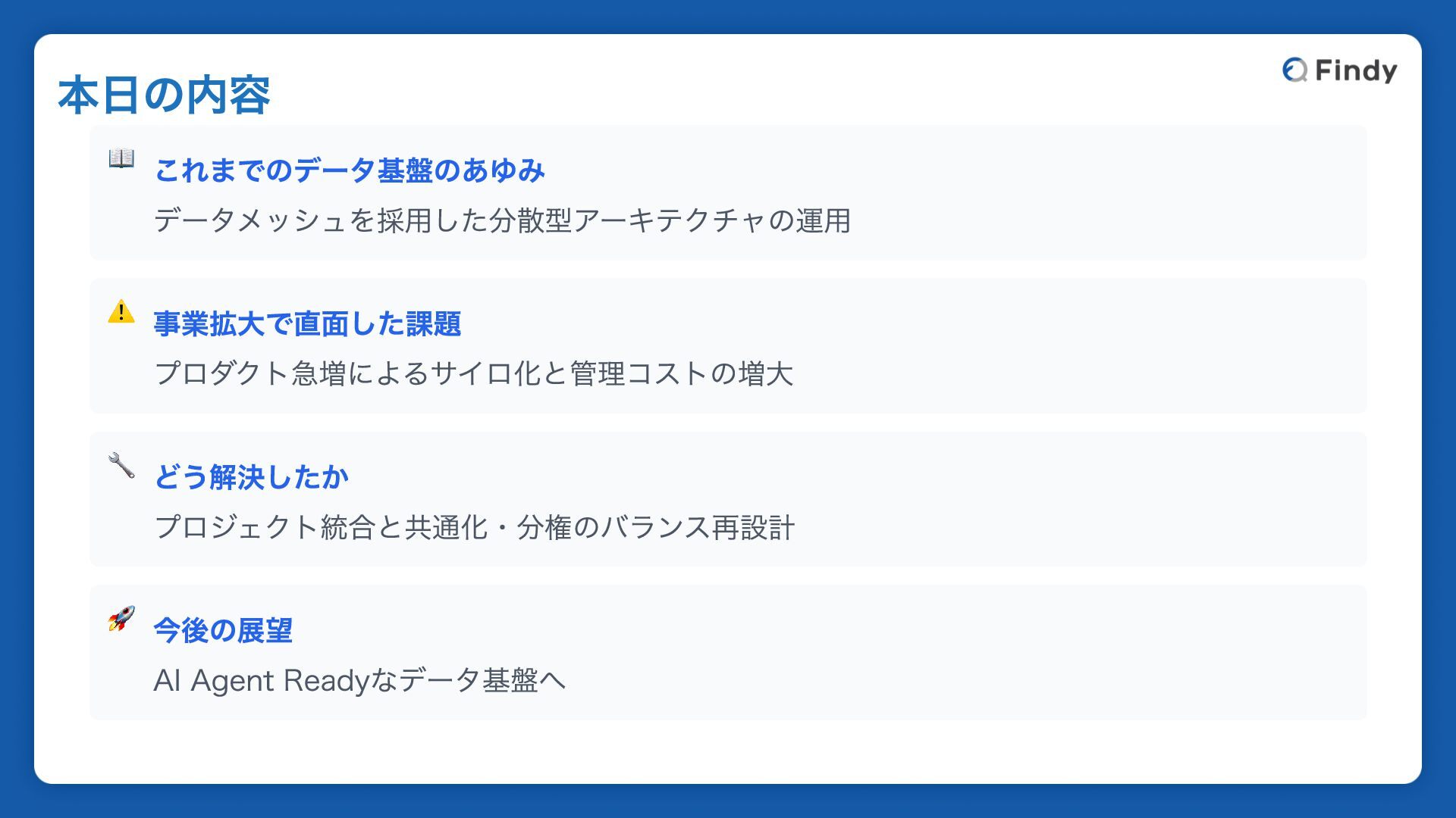 📖 これまでのデータ基盤のあゆみ データメッシュを採用した分散型アーキテクチャの運用 ⚠️ 事業拡大で直面した課題 プロダクト急増によるサイロ化と管理コストの増大 🔧 どう解決したか プロジェクト統合と共通化・分権のバランス再設計 🚀