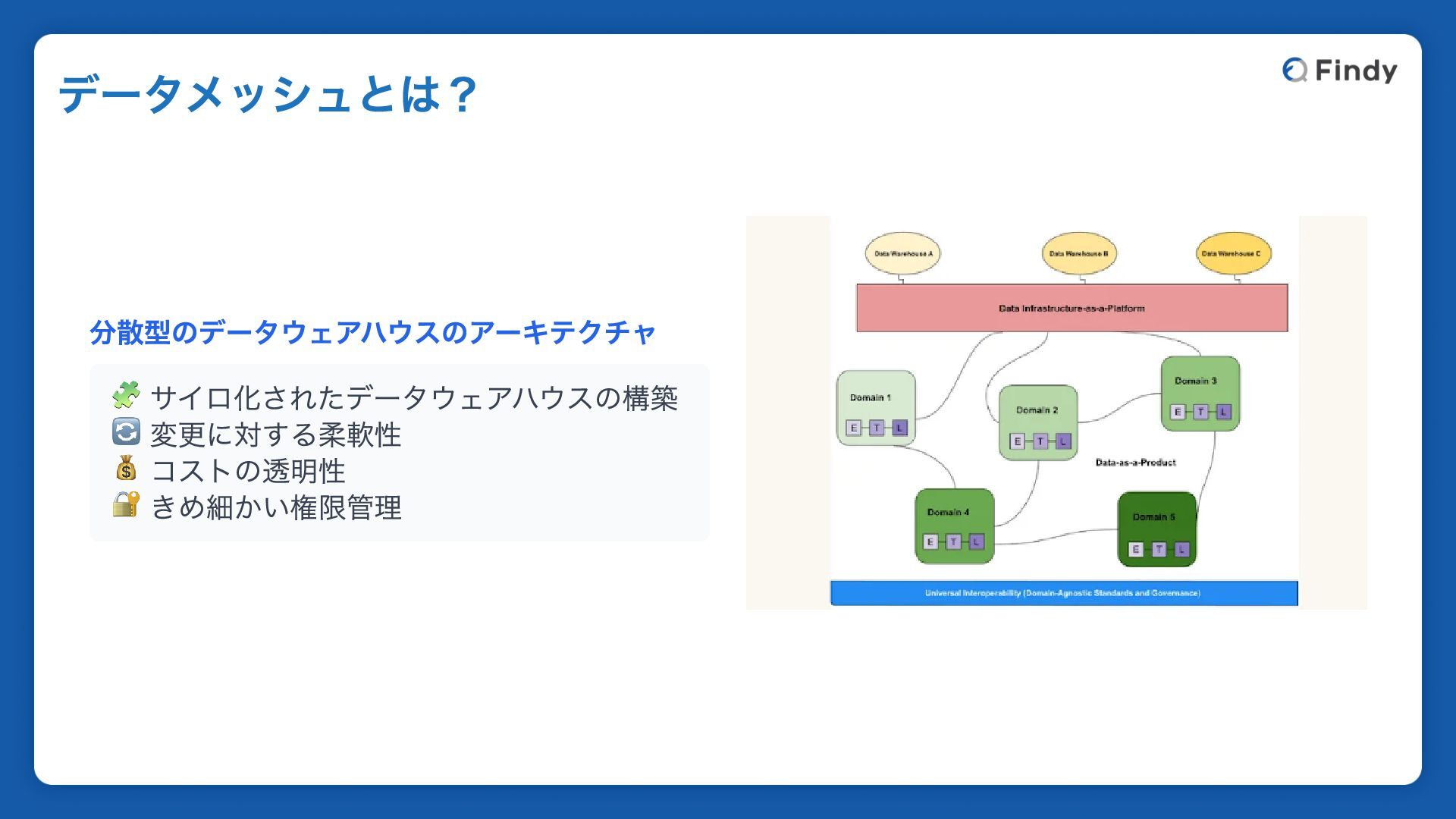分散型のデータウェアハウスのアーキテクチャ 🧩 サイロ化されたデータウェアハウスの構築 🔄 変更に対する柔軟性 💰 コストの透明性 🔐 きめ細かい権限管理 データメッシュとは?