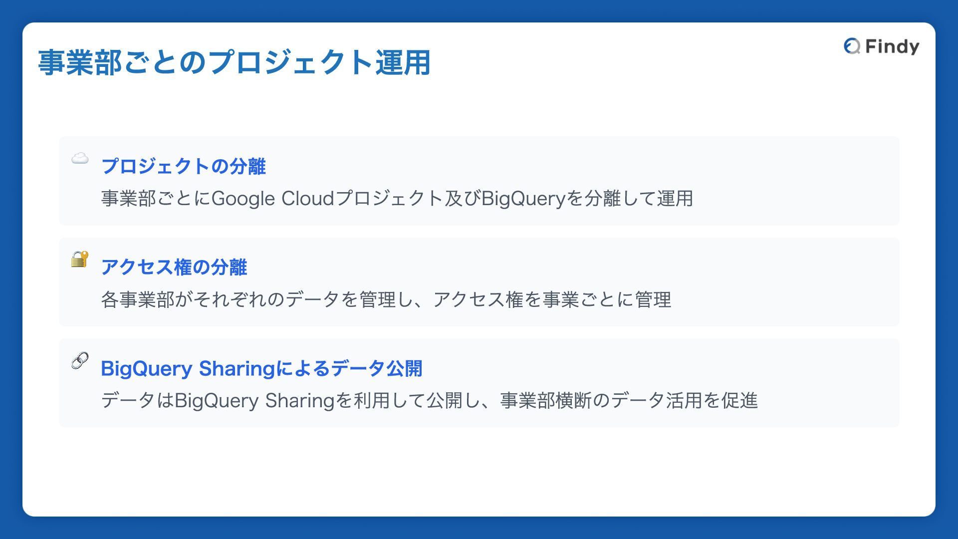 ☁️ プロジェクトの分離 事業部ごとにGoogle Cloudプロジェクト及びBigQueryを分離して運用 🔐 アクセス権の分離 各事業部がそれぞれのデータを管理し、アクセス権を事業ごとに管理 🔗 BigQuery Sharingによるデータ公開