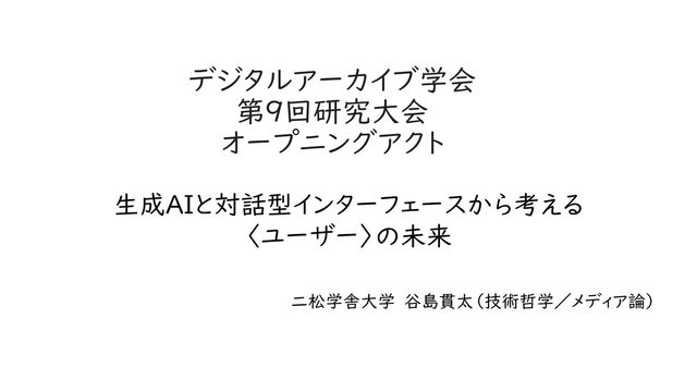 デジタルアーカイブ学会第9回研究大会オープニングアクトでのライトニングトーク用スライド。生成AIベースの対話型インターフェースがデジタルアーカイブと組み合わされることによって、ユーザーとデジタルアーカイブの関係が大きく組み変わる可能性を提起する。