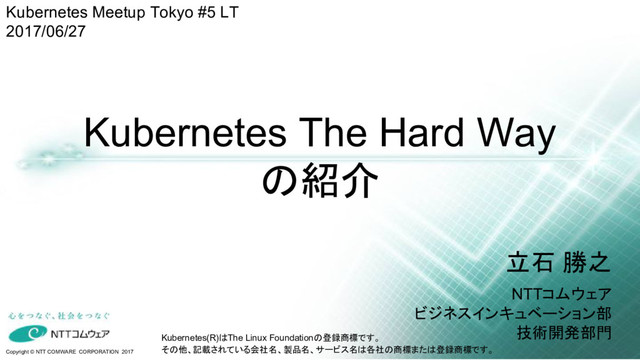 の紹介 立石 勝之 NTTコムウェア ビジネスインキュベーション部 技術開発部門 Kubernetes Meetup Tokyo #5 LT 2017/06/27 Kubernetes(R)はThe Linux Foundationの登録商標です。 その他、記載されている会社名、製品名、サービス名は各社の商標または登録商標です。