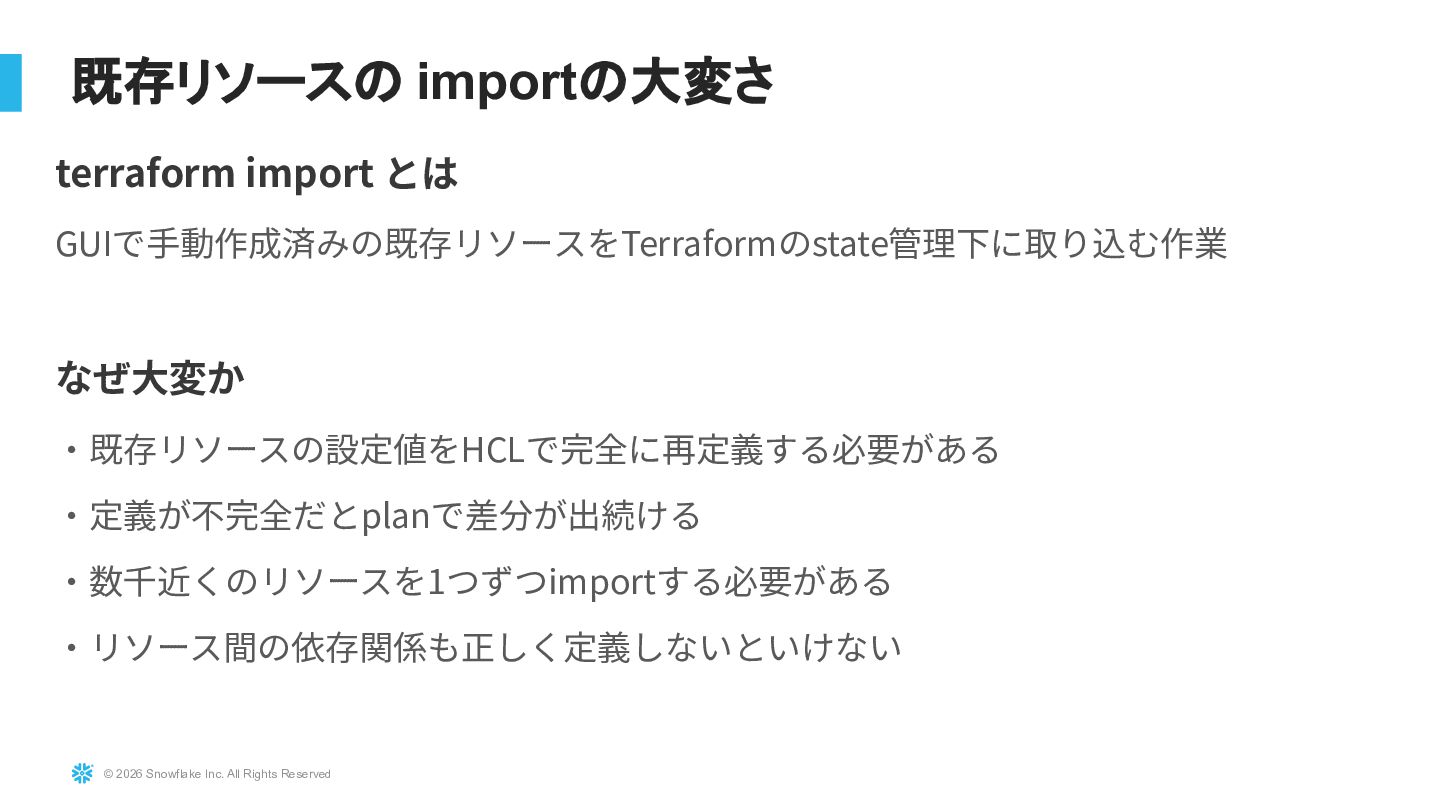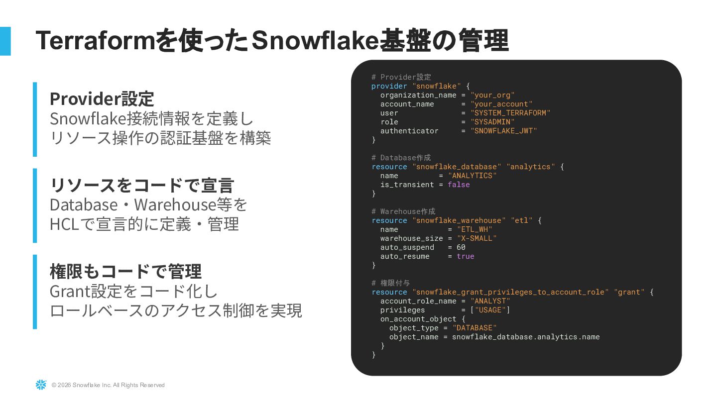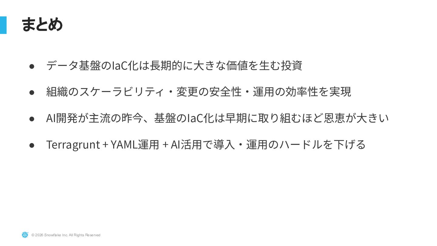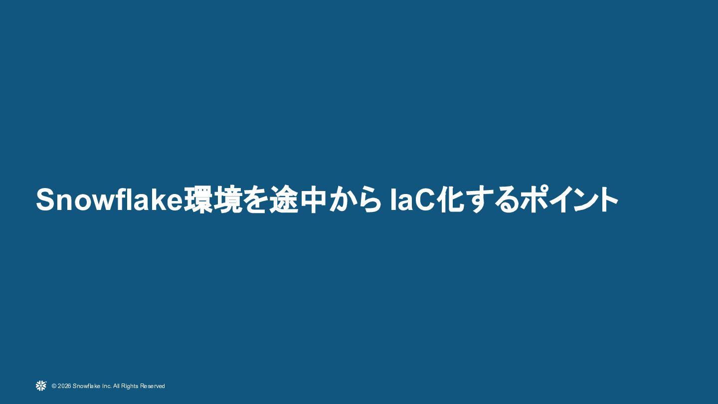 Snowflakeを大規模に運用している環境に対し、TerraformおよびTerragruntを用いたInfrastructure as Code導入の実践事例を紹介します。既存リソースを止めずにTerraform管理へ移行する際の課題(state import、設計分割、組織合意形成)と、その解決アプローチを解説します。さらにdev/stg/prodの環境分離設計、TerragruntによるDRY化、state分割による大規模基盤対応、CI/CD連携まで、実運用に耐えるIaC設計戦略を共有します。
