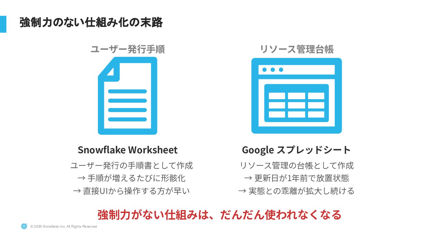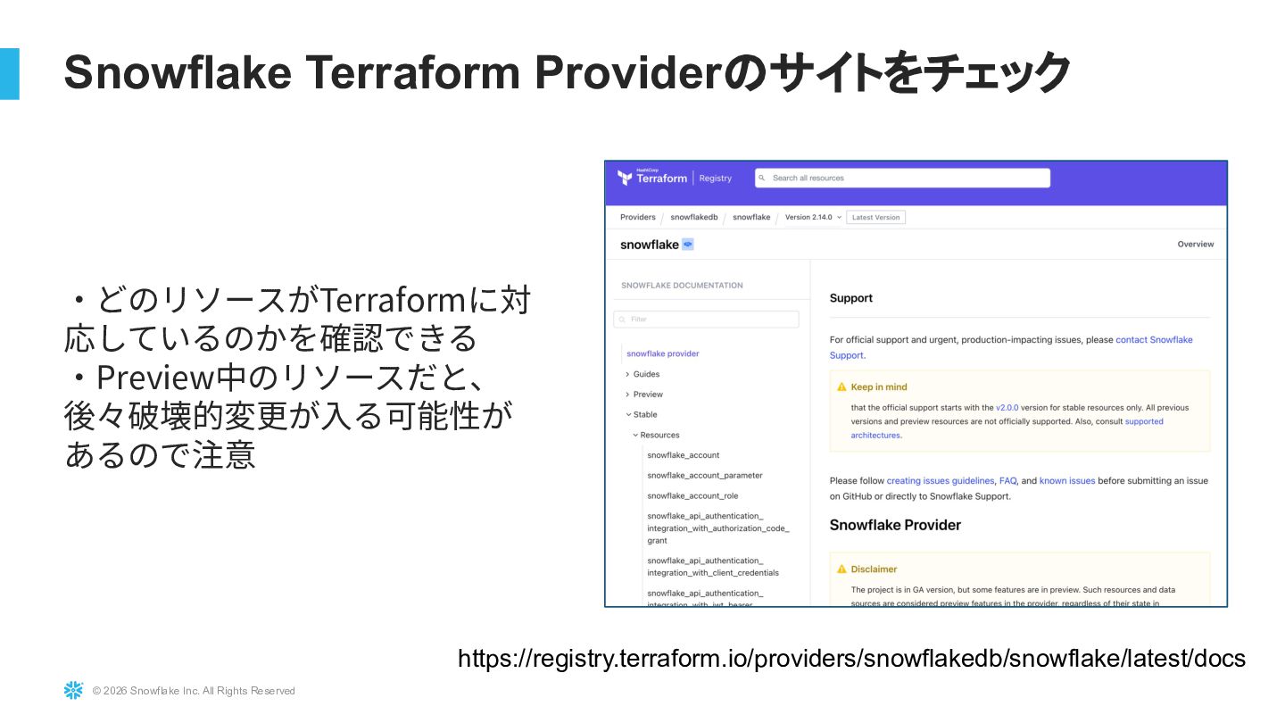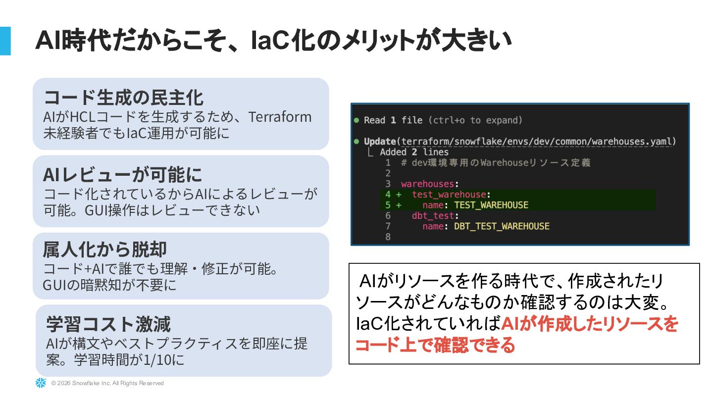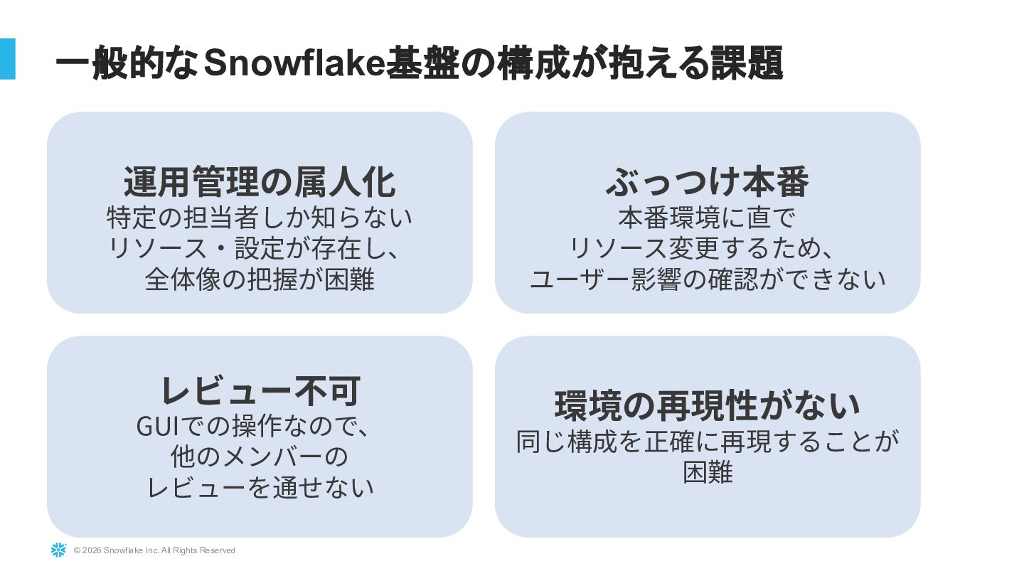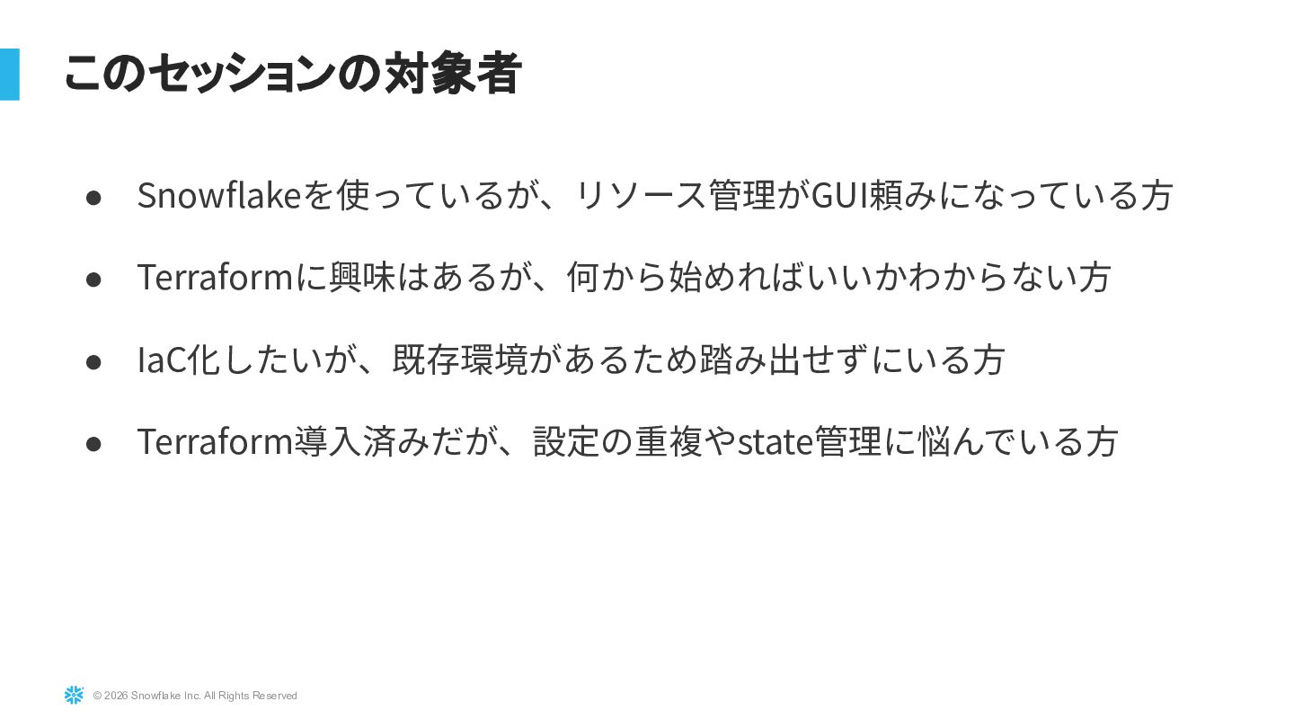 Snowflakeを大規模に運用している環境に対し、TerraformおよびTerragruntを用いたInfrastructure as Code導入の実践事例を紹介します。既存リソースを止めずにTerraform管理へ移行する際の課題(state import、設計分割、組織合意形成)と、その解決アプローチを解説します。さらにdev/stg/prodの環境分離設計、TerragruntによるDRY化、state分割による大規模基盤対応、CI/CD連携まで、実運用に耐えるIaC設計戦略を共有します。