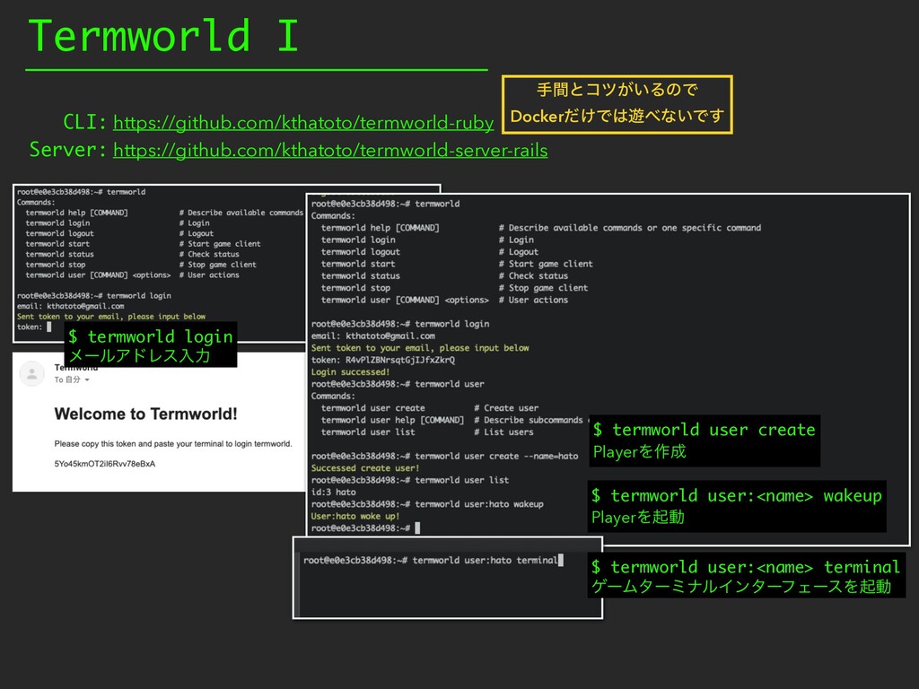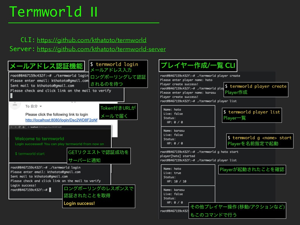 RPGπΫʔϧΈ͍ͨͳͷࣗͰ࡞Δ͔ʂ CLI͔ΒϓϨΠϠʔपลঢ়ଶ(εςʔλε,Ϛοϓ, ଞΩϟϥͷҐஔ,࣋ͪͳͲ)ΛશͯऔಘͰ͖Δ Α͏ʹ͢ΕλʔϛφϧViewΫϥΠΞϯτ ࡞ΕΔͣʂޙ͔Β࡞ΕΔ͜ͱ͕ॏཁ ༻ݴޠɾϥΠϒϥϦ Go cobra(CLI), viper(config file), gin gorilla/websocket Nuxt, Express MongoDB, Cypress, GitHub Actions $ termworld up Πϝʔδ $ termworld attack