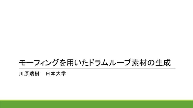 Convolutional Generative Adversarial Network for Symbolic-domain Music Generation(2017) → 畳み込みニューラルネットワーク(CNN)を使用した音楽生成 ・ 小林瑞季, 浜中雅俊, 新しいGTTMメロディモーフィング手法の提示 (2019) → GTTMに基づくメロディモーフィング手法の自動化 ・ 河原英紀, 生駒太一, 森勢将雅, 高橋徹, 豊田健一, 片寄晴弘, 歌唱音声モーフィングに基づく声質と歌 い回し転写の知覚的検討, (2017) → 高品質音声分析変換合成システムSTRAIGHTに基づくモーフィングによって、歌手の歌いまわしを転 写する ドラム音をモーフィングによって多様な音素材を生成すること に特化するものは見つからなかった