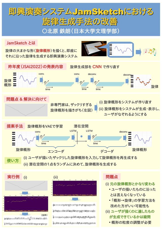 旋律の大まかな形(旋律概形)を描くと、即座に それに沿った旋律を生成する即興演奏システム 昨年度(JSAI2022)の発表内容 旋律生成部を CNN で作り直す 旋律 概形 旋律 ch time conv. conv. time ch deconv. time deconv. ch 問題点 & 解決に向けて 非専門家は、ザックリすぎる 旋律概形を描きがち(左図) (i) 旋律概形をシステムが作り直す (ii) 旋律概形をシステムが生成・表示し、 ユーザがなぞれるようにする 提案手法 旋律概形をVAEで学習 旋律概形 conv. ch time LSTM LSTM time ch deconv. 旋律概形 エンコーダ デコーダ 潜在空間 使い方 (i) ユーザが描いたザックリした旋律概形を入力して旋律概形を再生成する (ii) 潜在空間の1点をランダムに決めて、旋律概形を生成する 実行例 (抜粋) (i) (ii) 問題点 (i) 元の旋律概形とかなり変わる • ユーザの描いたものに沿った とは言えなくなっている • 「概形→旋律」の学習方法を 改めた方がいい可能性も (ii) ユーザが描くのに適したもの が生成できているかは疑問 • 概形の粒度の調整が必要