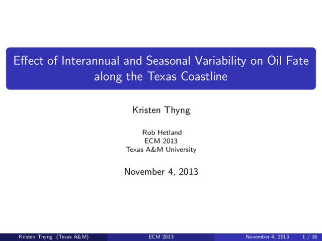 the Texas Coastline Kristen Thyng Rob Hetland ECM 2013 Texas A&M University November 4, 2013 Kristen Thyng (Texas A&M) ECM 2013 November 4, 2013 1 / 16