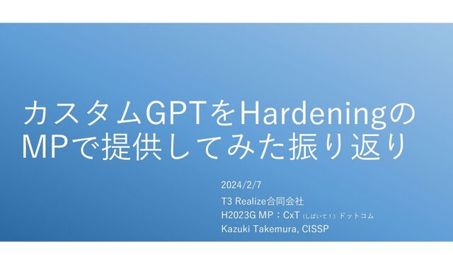 カスタムGPTをHardeningの MPで提供してみた振り返り 2024/2/7 T3 Realize合同会社 H2023G MP:CxT (しばいて!)ドットコム Kazuki Takemura,
