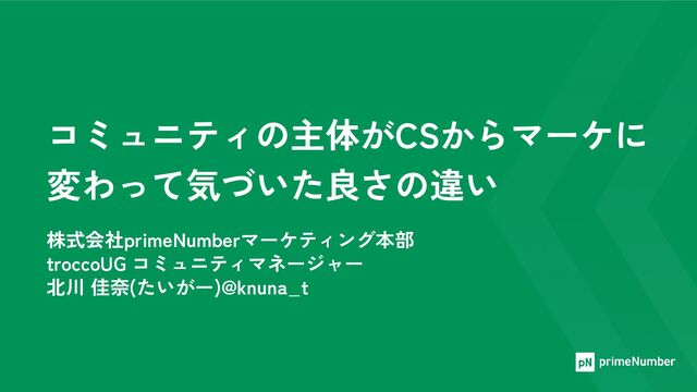 コミュニティの主体がCSからマーケに 変わって気づいた良さの違い 株式会社primeNumberマーケティング本部 troccoUG コミュニティマネージャー 北川 佳奈(たいがー)@knuna_t