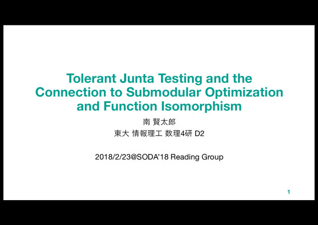 Y(•EO + ) 楕円体法 2. Cunningham (1985) (¡ log ⋅ EO) 3. Schrijver (2000) ([ ⋅ EO + £) 4. Iwata, Fleischer, Fujishige (2000) (• ⋅ EO log ) ( log ⋅ EO) 5. Iwata, Fleischer (2000) ( ⋅ EO + [) 6. Iwata (2003) ((Z ⋅ EO + •) log ) ((¡ ⋅ EO + ) log ) 7. Vygen (2003) ( ⋅ EO + [) 8. Orlin (2007) (• ⋅ EO + ¡) 9. Iwata, Orlin (2009) ( Z ⋅ EO + • log ) ( • ⋅ EO + ¡ log ) 10. Chakrabarty, Jain, Kothari (2014) ( •EO + N) ( の定義略 ) Fujishige—Wolfe 11. Lee, Sidford, Wong (2015) (N log ⋅ EO + ¥ log¦ B ) (¥ logN ⋅ EO + Z log¦ B ) 切除平⾯法 12. Chakrabarty, Lee, Sidford, Wong (2017) Y(¥ ⋅ EO) 勾配降下法 制約なしSFMのアルゴリズムたち : 2 ( → [−, ] Noisy separation oracleを 作ることができれば動く à 今回の⽤途に適する!