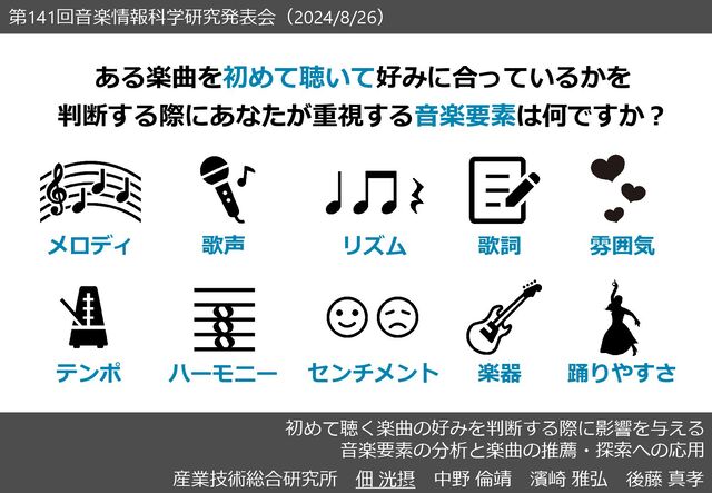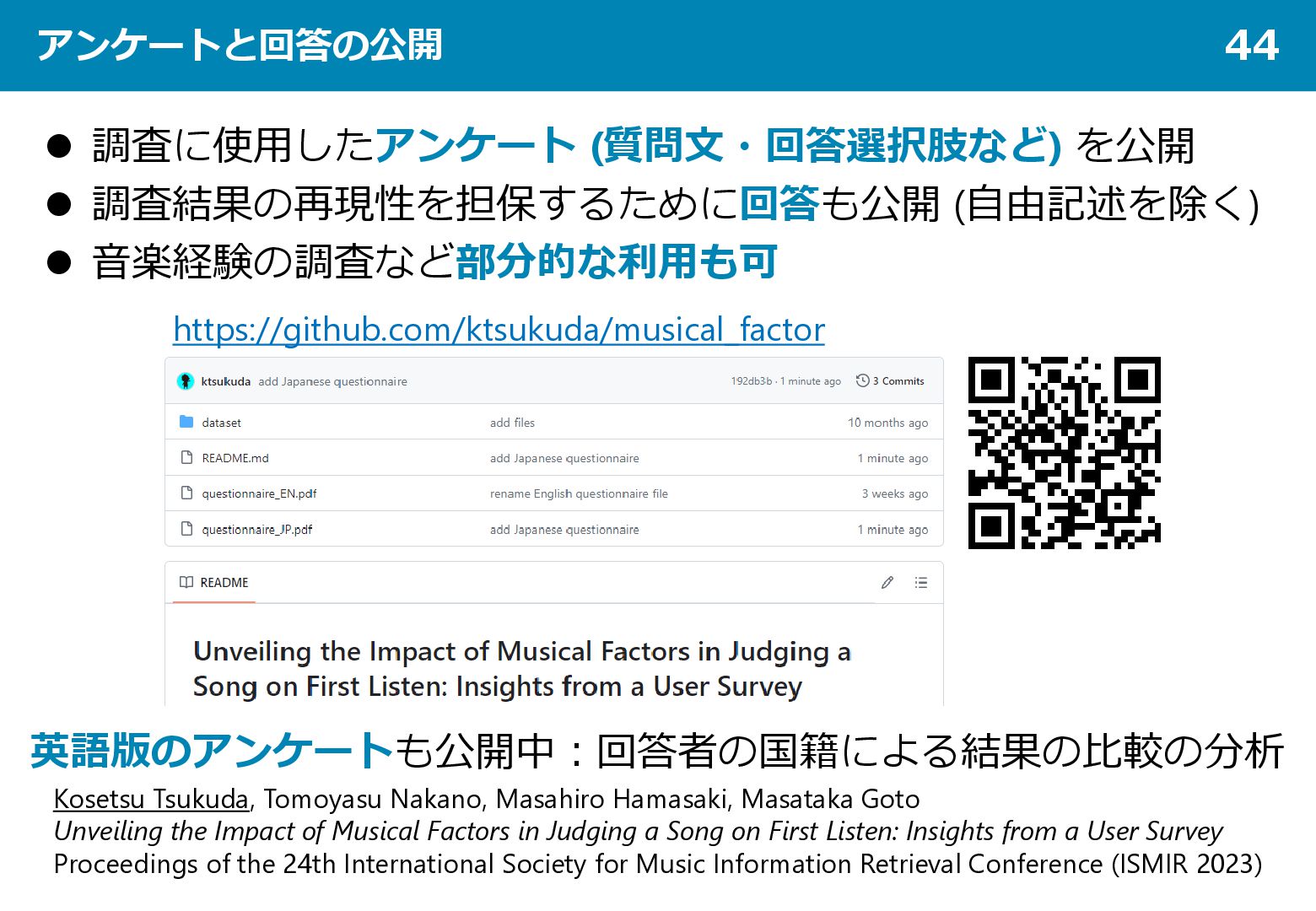 Goto Unveiling the Impact of Musical Factors in Judging a Song on First Listen: Insights from a User Survey Proceedings of the 24th International Society for Music Information Retrieval Conference (ISMIR 2023) 調査に使用したアンケート (質問文・回答選択肢など) を公開 調査結果の再現性を担保するために回答も公開 (自由記述を除く) 音楽経験の調査など部分的な利用も可 https://github.com/ktsukuda/musical_factor