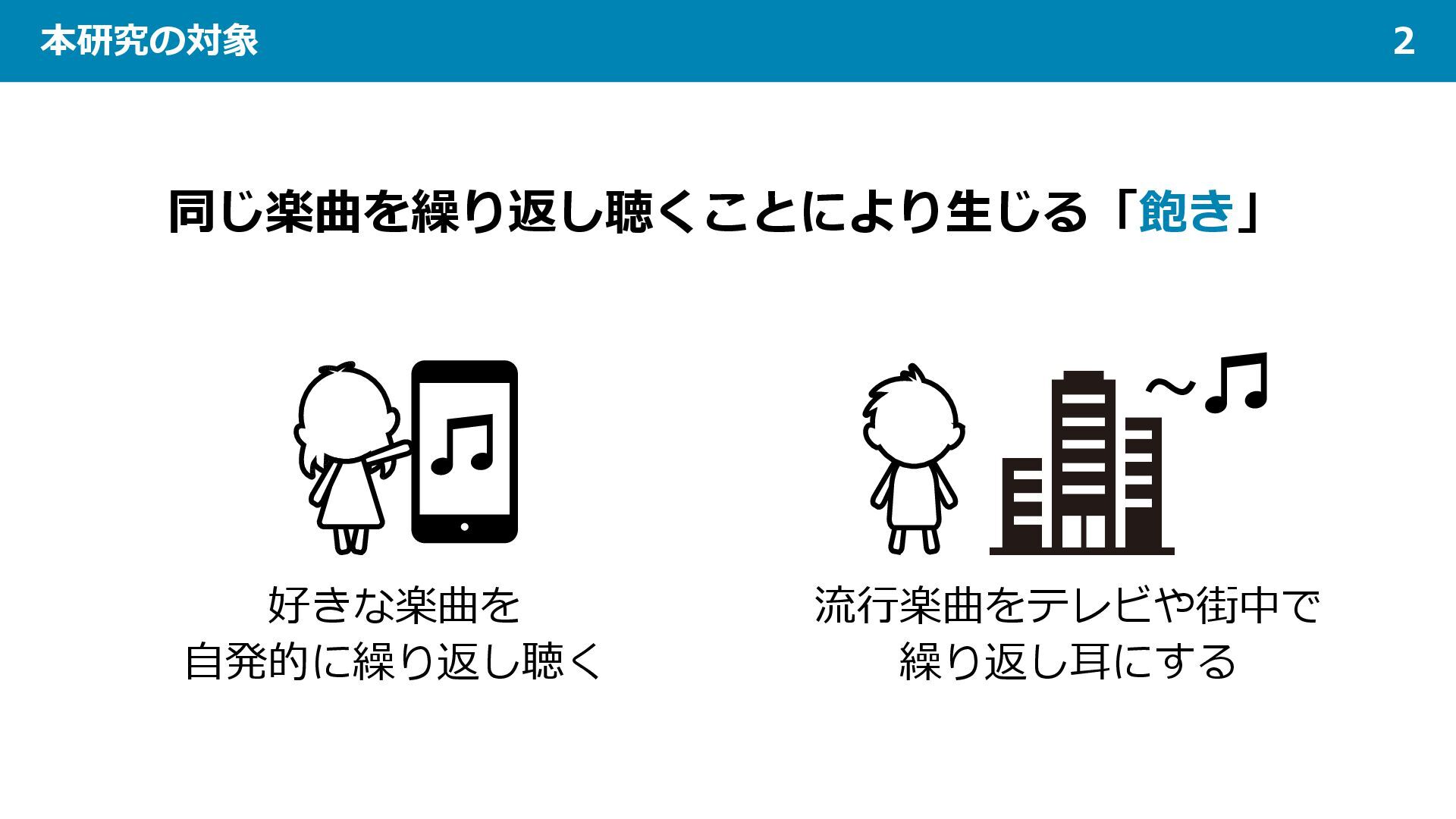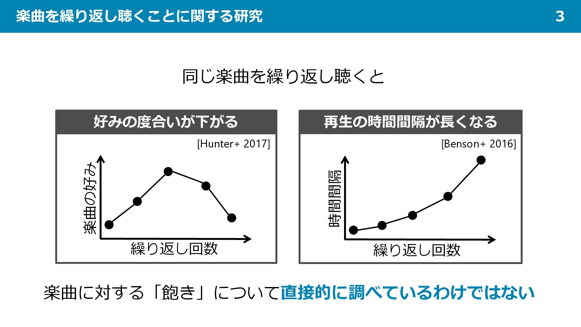 本研究の対象 2 同じ楽曲を繰り返し聴くことにより生じる「飽き」 好きな楽曲を 自発的に繰り返し聴く 流行楽曲をテレビや街中で 繰り返し耳にする ~