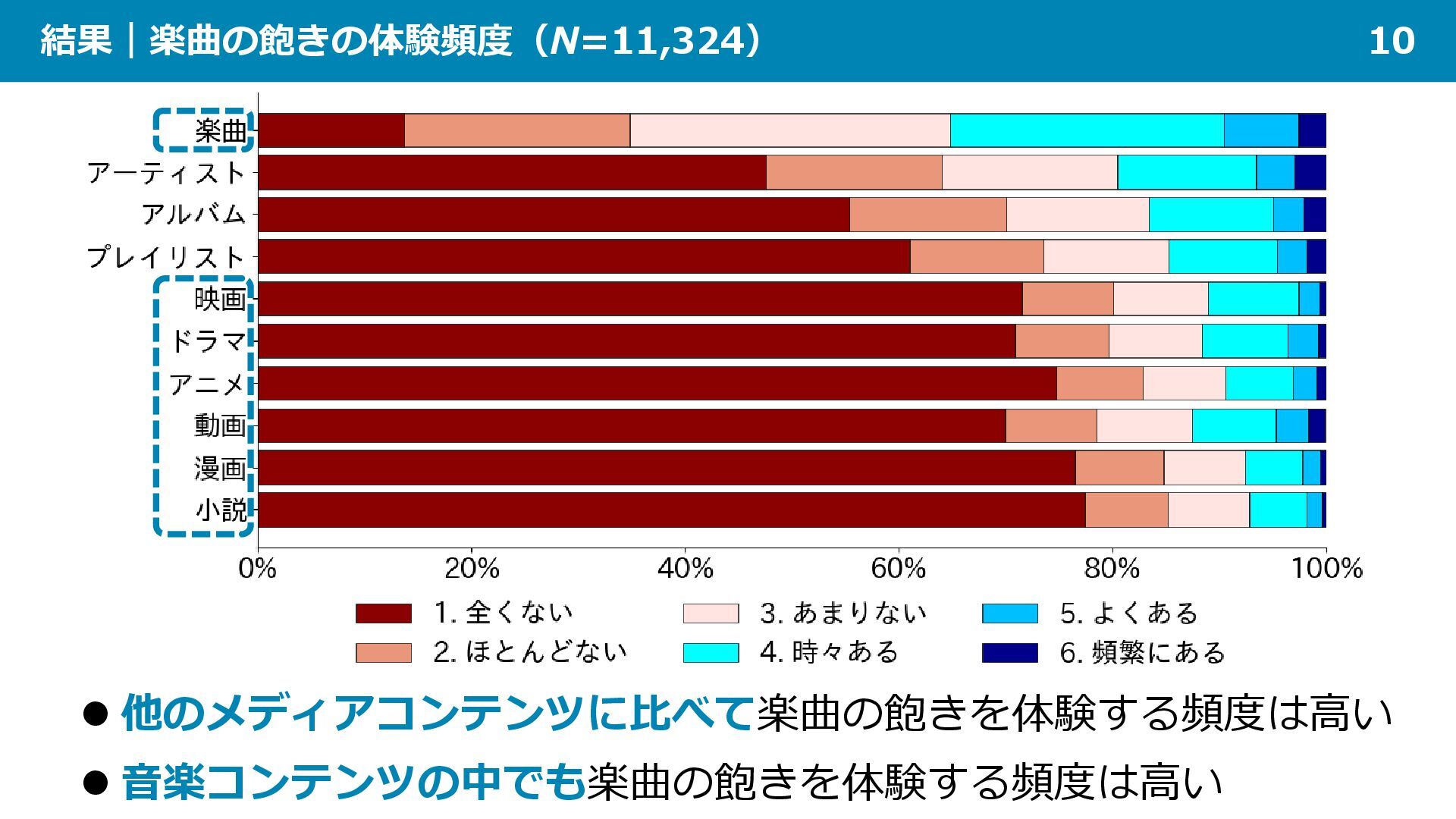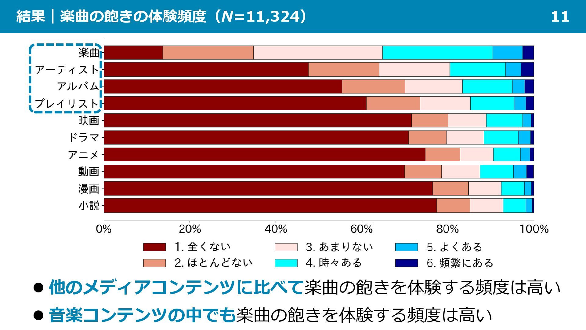 結果|楽曲の飽きの体験頻度(N=11,324) 10 他のメディアコンテンツに比べて楽曲の飽きを体験する頻度は高い 音楽コンテンツの中でも楽曲の飽きを体験する頻度は高い