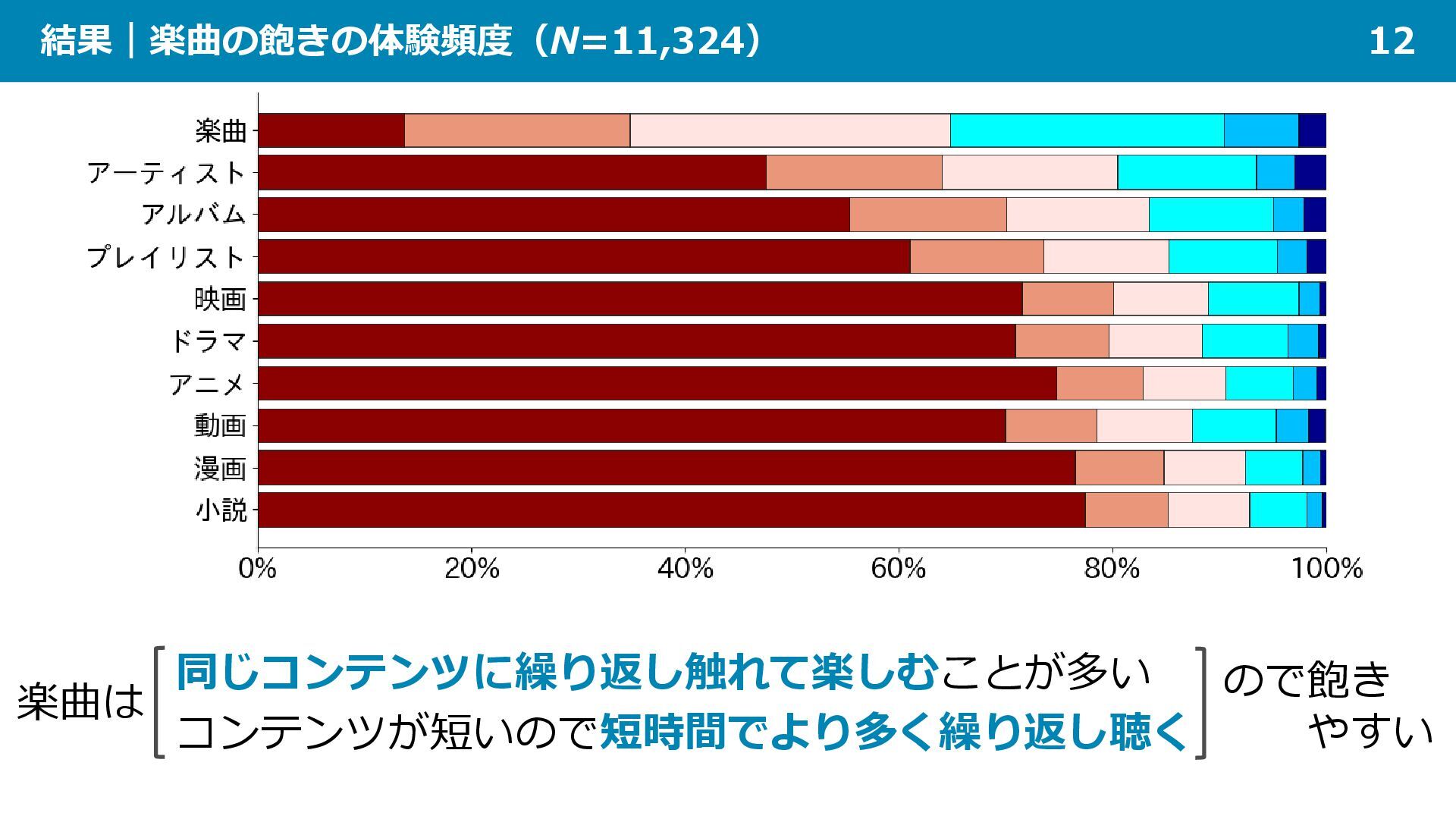結果|楽曲の飽きの体験頻度(N=11,324) 12 同じコンテンツに繰り返し触れて楽しむことが多い コンテンツが短いので短時間でより多く繰り返し聴く 楽曲は ので飽き やすい