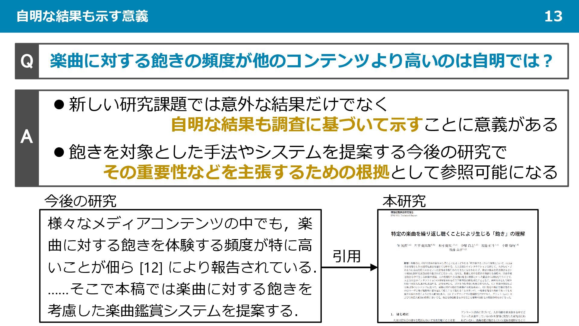 自明な結果も示す意義 13 楽曲に対する飽きの頻度が他のコンテンツより高いのは自明では? Q A 新しい研究課題では意外な結果だけでなく 自明な結果も調査に基づいて示すことに意義がある 飽きを対象とした手法やシステムを提案する今後の研究で