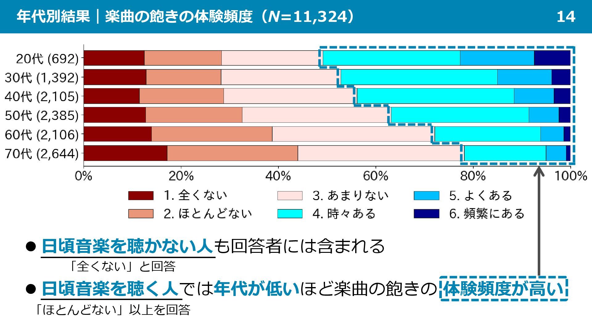 年代別結果|楽曲の飽きの体験頻度(N=11,324) 14 日頃音楽を聴かない人も回答者には含まれる 日頃音楽を聴く人では年代が低いほど楽曲の飽きの 体験頻度が高い 「全くない」と回答 「ほとんどない」以上を回答