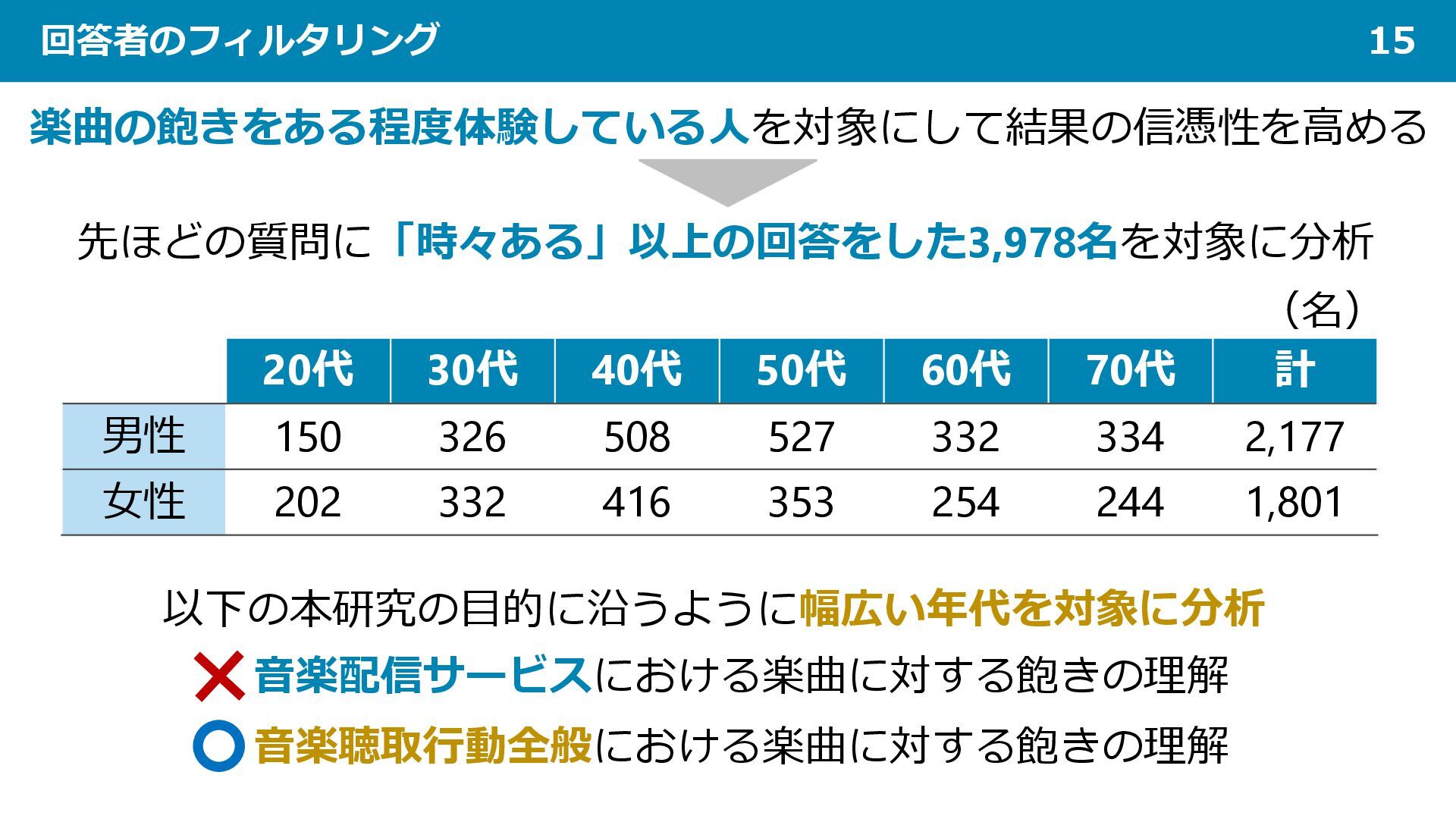 150 326 508 527 332 334 2,177 女性 202 332 416 353 254 244 1,801 (名) 先ほどの質問に「時々ある」以上の回答をした3,978名を対象に分析 楽曲の飽きをある程度体験している人を対象にして結果の信憑性を高める 以下の本研究の目的に沿うように幅広い年代を対象に分析 音楽配信サービスにおける楽曲に対する飽きの理解 音楽聴取行動全般における楽曲に対する飽きの理解
