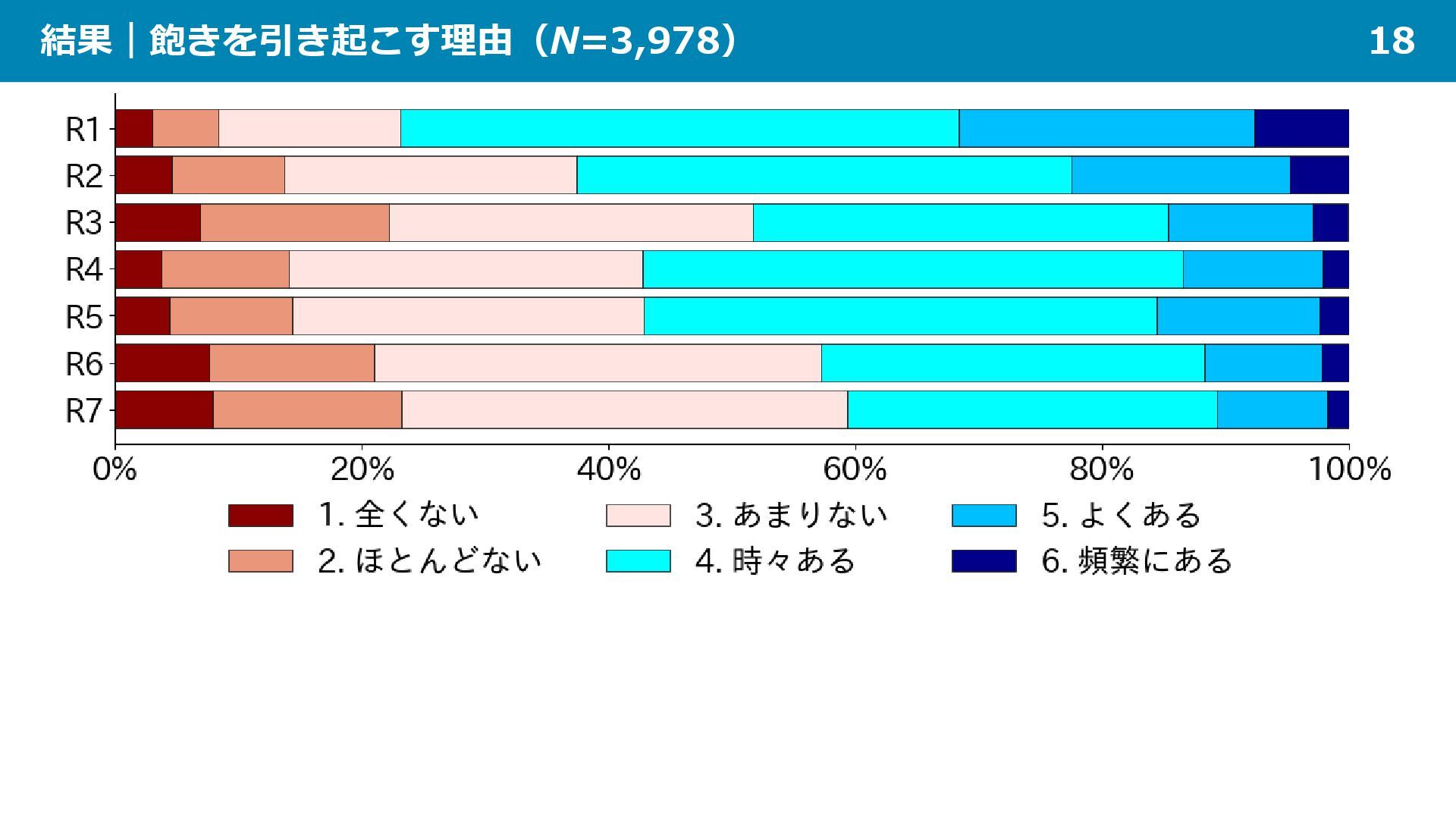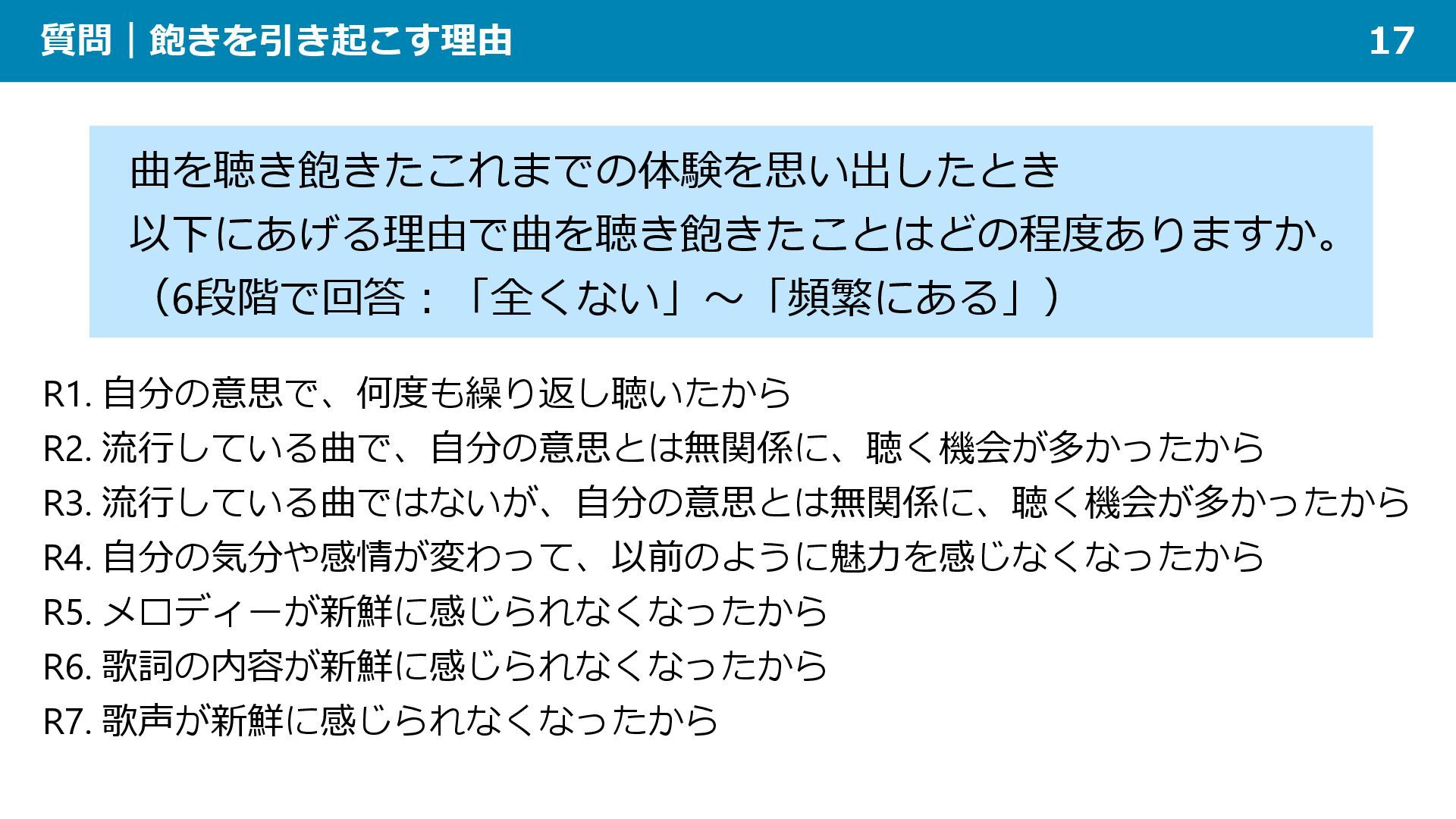 質問|飽きを引き起こす理由 17 曲を聴き飽きたこれまでの体験を思い出したとき 以下にあげる理由で曲を聴き飽きたことはどの程度ありますか。 (6段階で回答:「全くない」~「頻繁にある」) R1. 自分の意思で、何度も繰り返し聴いたから R2. 流行している曲で、自分の意思とは無関係に、聴く機会が多かったから R3.