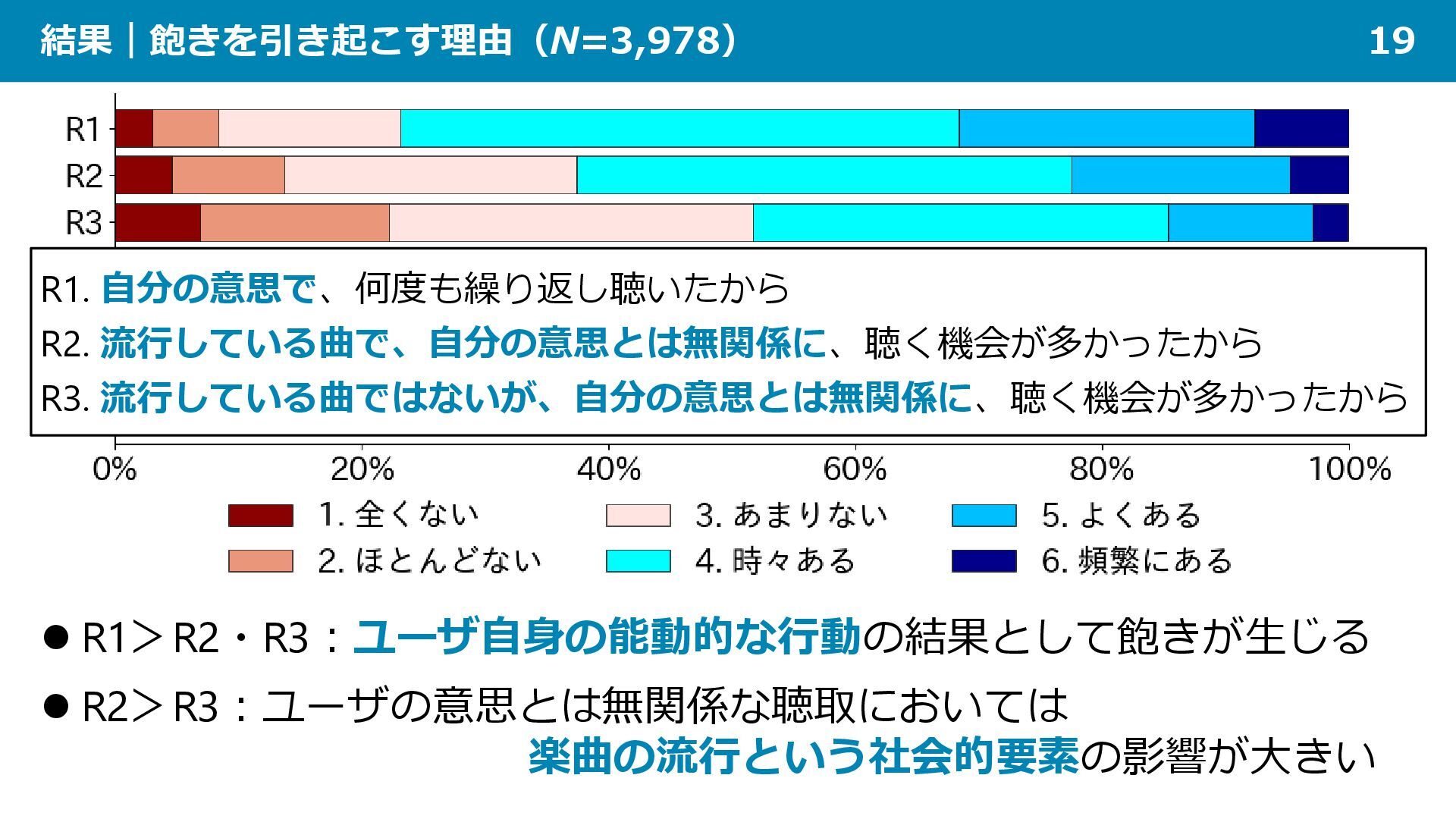 R2>R3:ユーザの意思とは無関係な聴取においては 楽曲の流行という社会的要素の影響が大きい