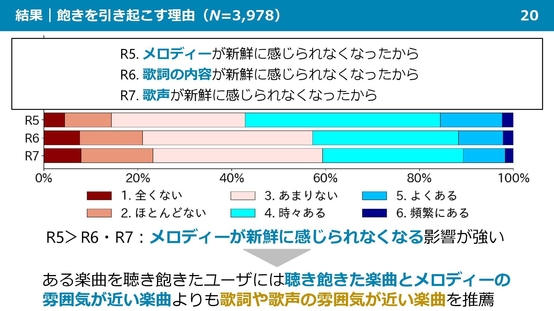結果|飽きを引き起こす理由(N=3,978) 19 R1. 自分の意思で、何度も繰り返し聴いたから R2. 流行している曲で、自分の意思とは無関係に、聴く機会が多かったから R3. 流行している曲ではないが、自分の意思とは無関係に、聴く機会が多かったから R1>R2・R3:ユーザ自身の能動的な行動の結果として飽きが生じる