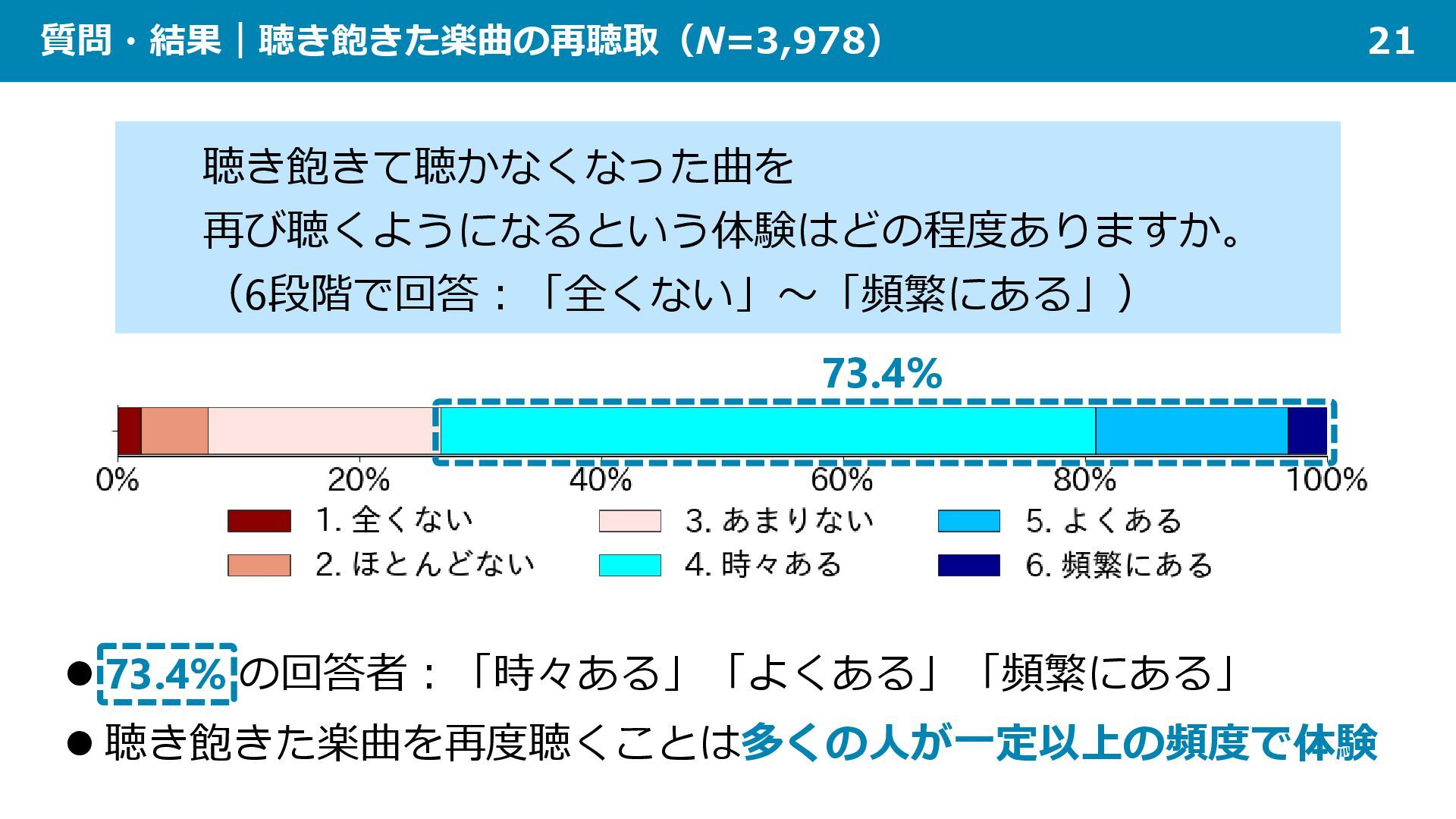 質問・結果|聴き飽きた楽曲の再聴取(N=3,978) 21 聴き飽きて聴かなくなった曲を 再び聴くようになるという体験はどの程度ありますか。 (6段階で回答:「全くない」~「頻繁にある」) 73.4% の回答者:「時々ある」「よくある」「頻繁にある」 聴き飽きた楽曲を再度聴くことは多くの人が一定以上の頻度で体験