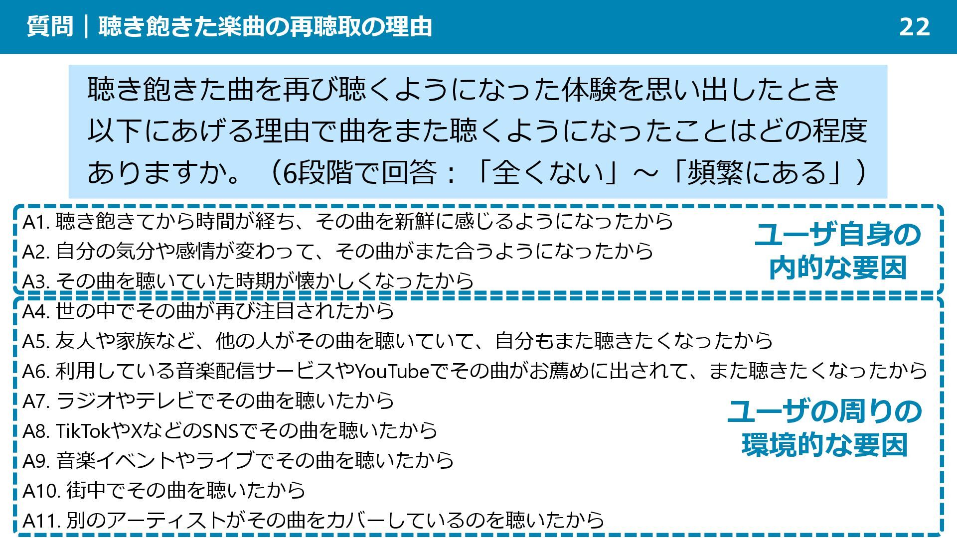 その曲を聴いていた時期が懐かしくなったから A4. 世の中でその曲が再び注目されたから A5. 友人や家族など、他の人がその曲を聴いていて、自分もまた聴きたくなったから A6. 利用している音楽配信サービスやYouTubeでその曲がお薦めに出されて、また聴きたくなったから A7. ラジオやテレビでその曲を聴いたから A8. TikTokやXなどのSNSでその曲を聴いたから A9. 音楽イベントやライブでその曲を聴いたから A10. 街中でその曲を聴いたから A11. 別のアーティストがその曲をカバーしているのを聴いたから ユーザ自身の 内的な要因 ユーザの周りの 環境的な要因
