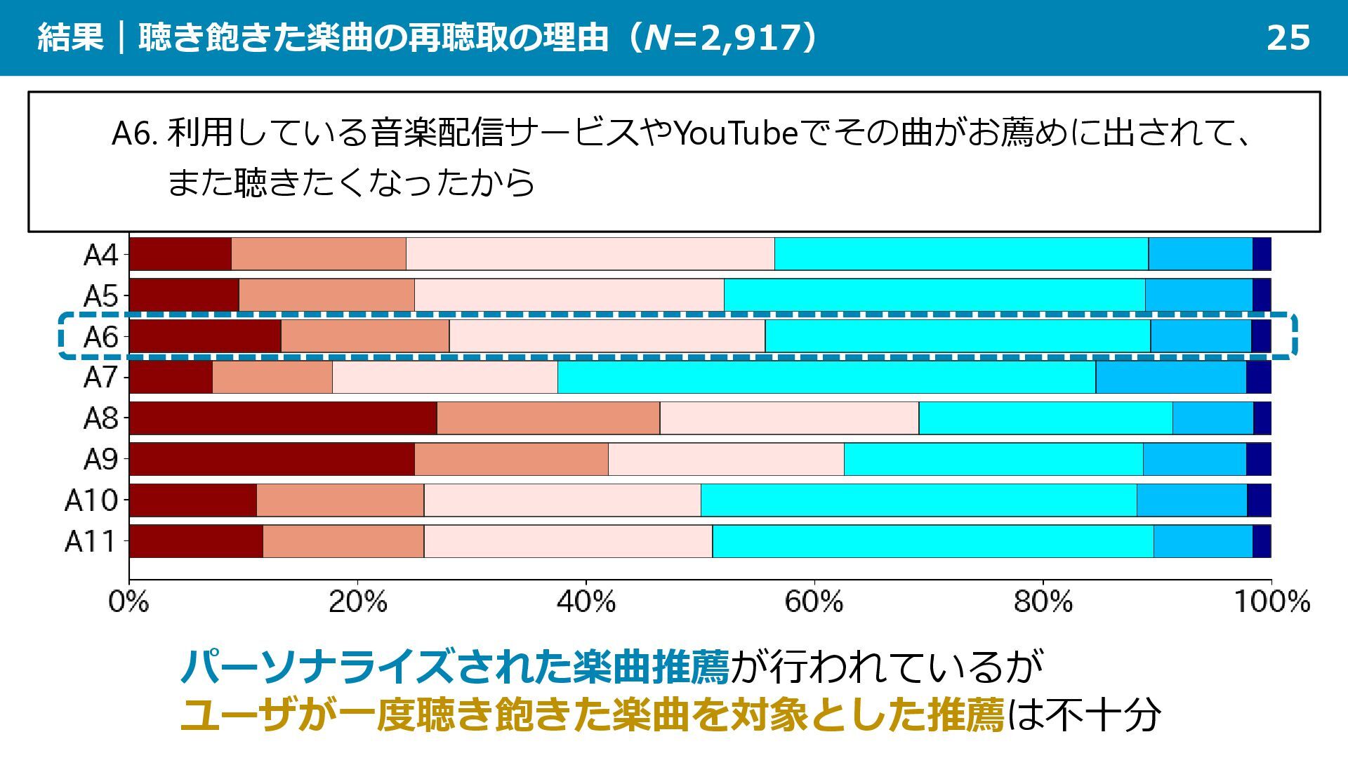 結果|聴き飽きた楽曲の再聴取の理由(N=2,917) 25 A6. 利用している音楽配信サービスやYouTubeでその曲がお薦めに出されて、 また聴きたくなったから パーソナライズされた楽曲推薦が行われているが ユーザが一度聴き飽きた楽曲を対象とした推薦は不十分