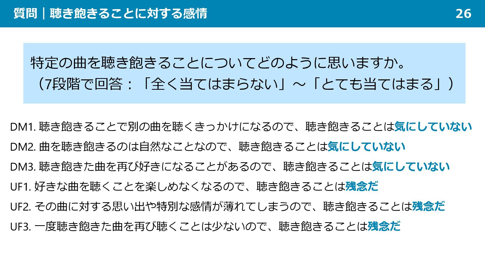 UF1. 好きな曲を聴くことを楽しめなくなるので、聴き飽きることは残念だ UF2. その曲に対する思い出や特別な感情が薄れてしまうので、聴き飽きることは残念だ UF3. 一度聴き飽きた曲を再び聴くことは少ないので、聴き飽きることは残念だ