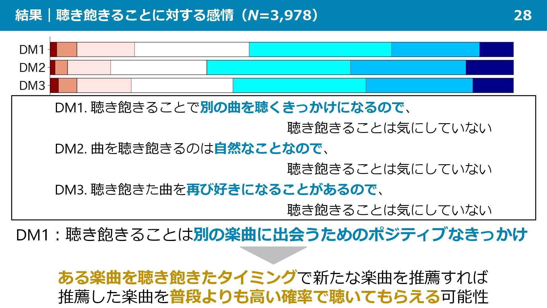 結果|聴き飽きることに対する感情(N=3,978) 28 DM1. 聴き飽きることで別の曲を聴くきっかけになるので、 聴き飽きることは気にしていない DM2. 曲を聴き飽きるのは自然なことなので、 聴き飽きることは気にしていない DM3. 聴き飽きた曲を再び好きになることがあるので、