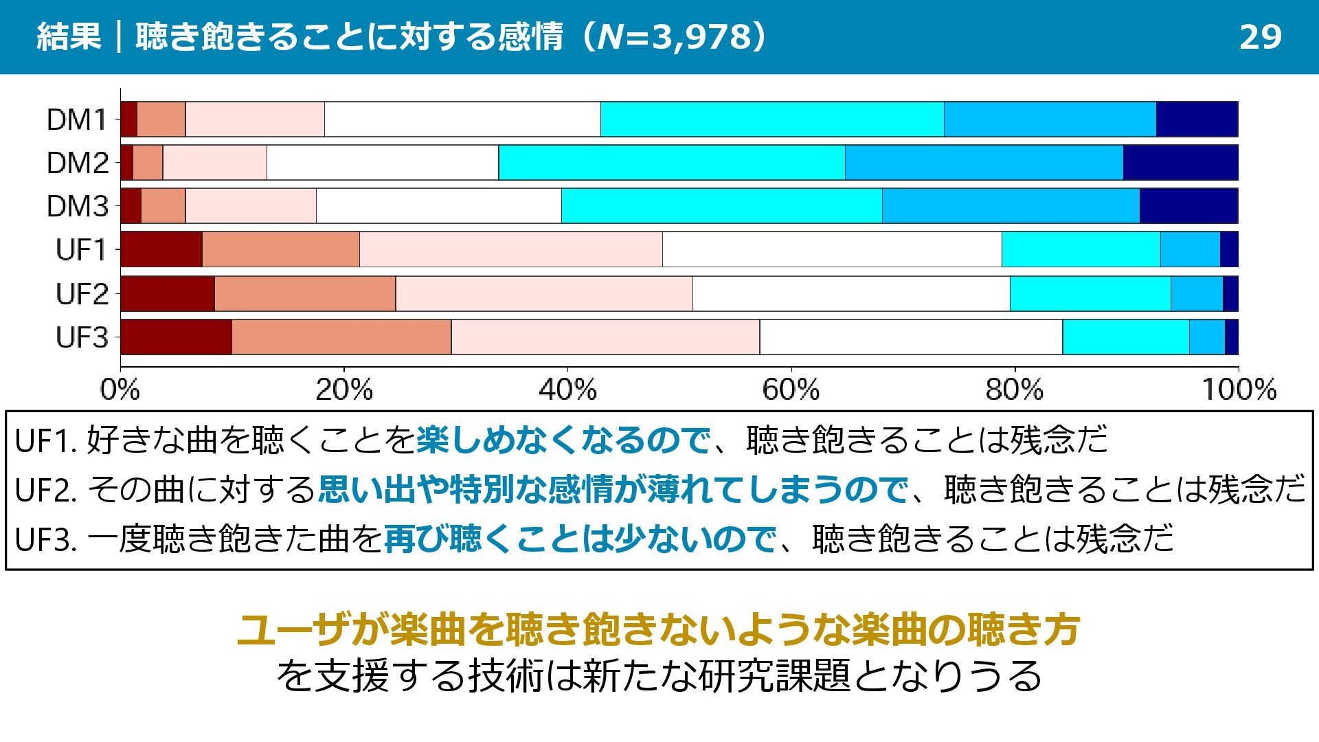 結果|聴き飽きることに対する感情(N=3,978) 29 UF1. 好きな曲を聴くことを楽しめなくなるので、聴き飽きることは残念だ UF2. その曲に対する思い出や特別な感情が薄れてしまうので、聴き飽きることは残念だ UF3. 一度聴き飽きた曲を再び聴くことは少ないので、聴き飽きることは残念だ ユーザが楽曲を聴き飽きないような楽曲の聴き方 を支援する技術は新たな研究課題となりうる