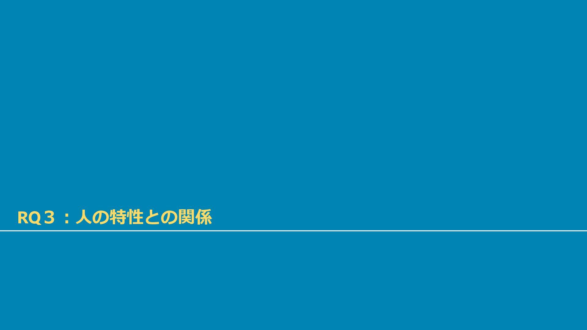 DM3 UF1 UF2 UF3 開放性 −0.0297 −0.0144 −0.00173 −0.0354 −0.0373 0.00152 0.0182 0.0354 協調性 −0.106 0.0193 0.138 0.167 0.170 −0.0658 −0.0525 −0.0821 誠実性 −0.0978 −0.0483 −0.0138 −0.0121 −0.0109 0.00341 0.0292 0.0404 神経症傾向 0.106 0.0590 0.0127 0.0336 0.0273 0.0274 0.00761 −0.0204 開放性 0.0101 0.0338 −0.0248 −0.0474 −0.0230 0.0182 0.0369 0.0396 太字:有意な相関(𝑝𝑝 < 0.001) 協調性・誠実性が高い 多様な楽曲を楽しむ傾向 [Ferwerda+ 2016] 楽曲を聴き飽きる体験の少なさに影響している可能性