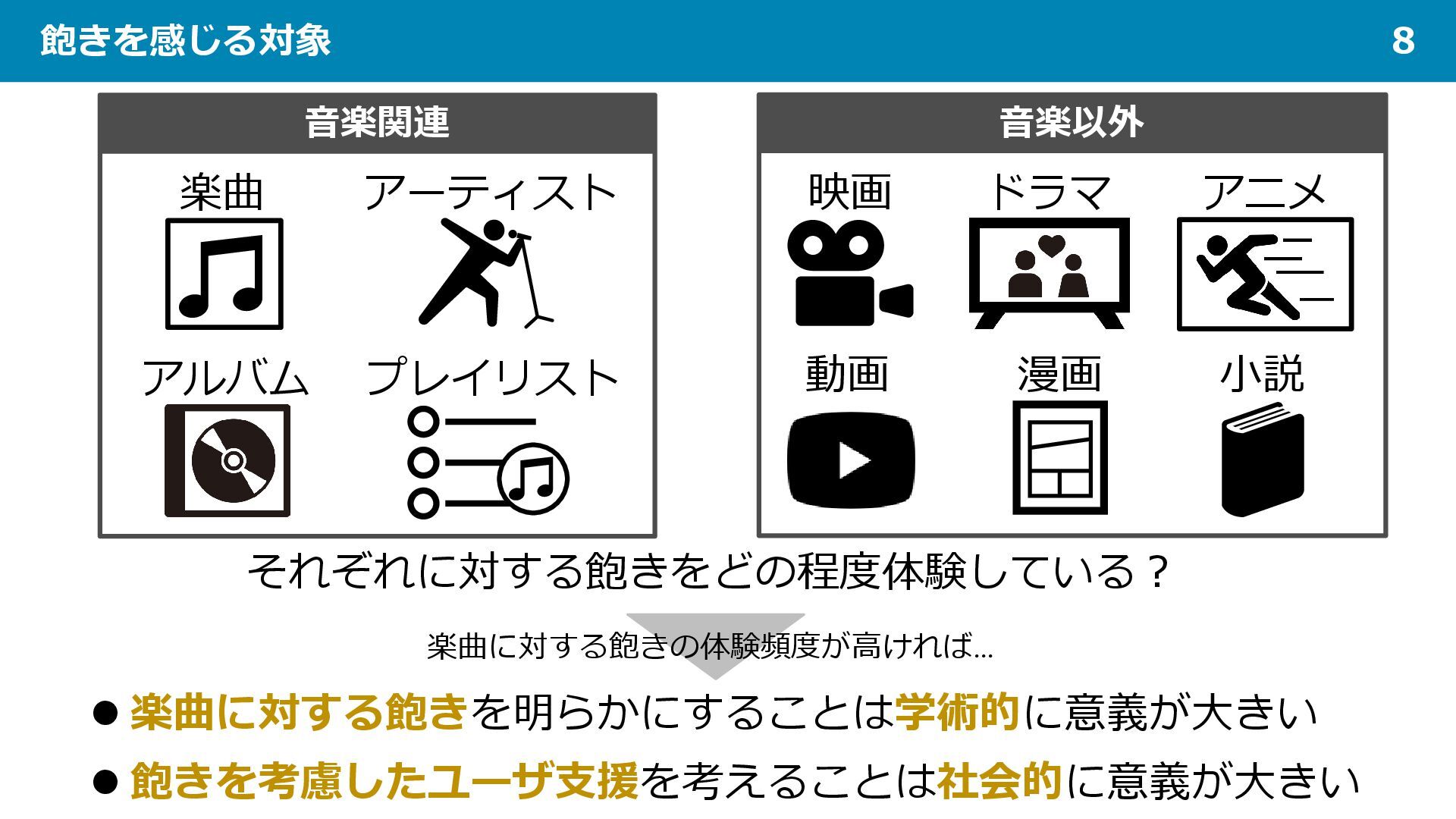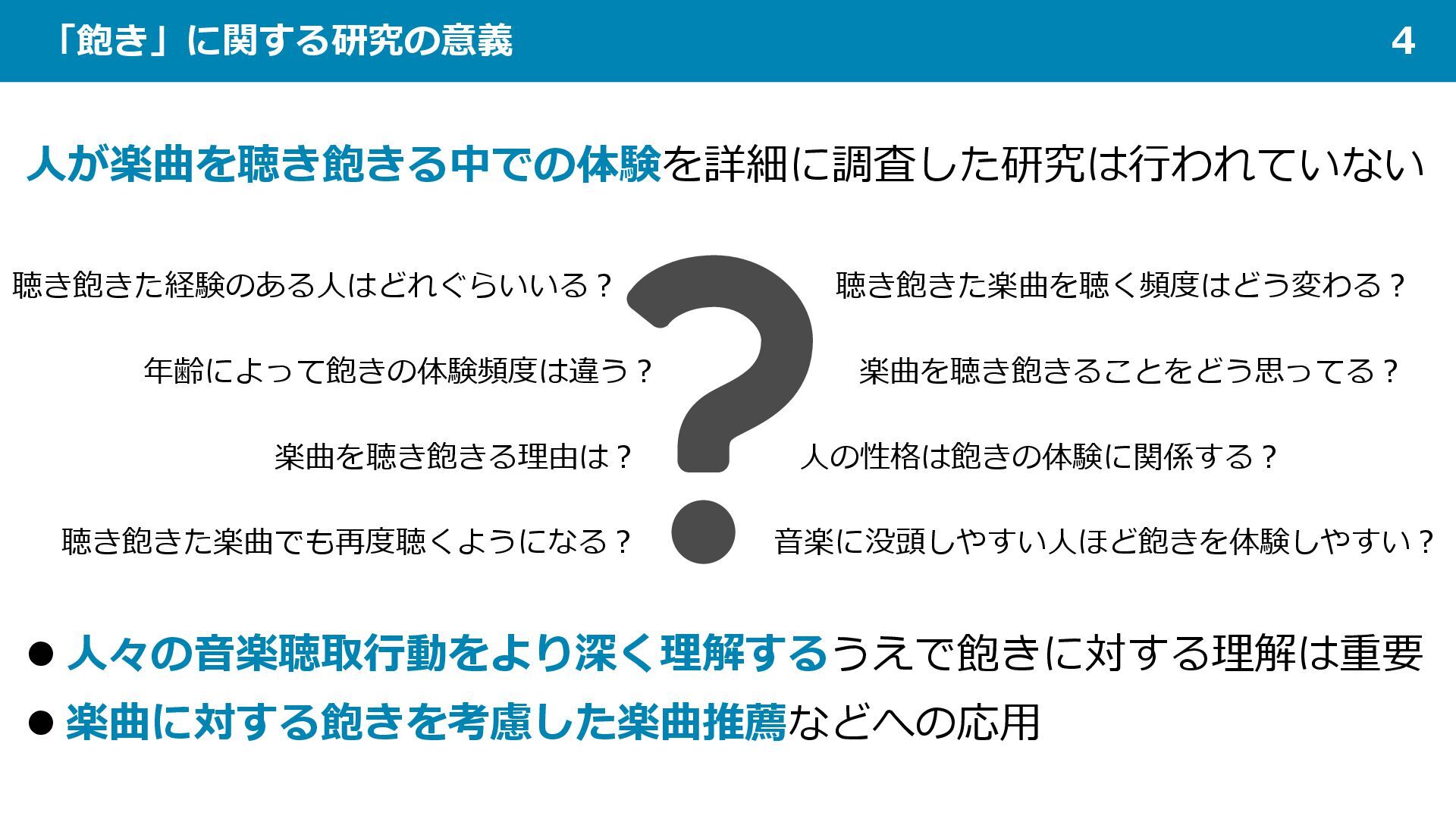 人々の音楽聴取行動をより深く理解するうえで飽きに対する理解は重要 楽曲に対する飽きを考慮した楽曲推薦などへの応用 人が楽曲を聴き飽きる中での体験を詳細に調査した研究は行われていない