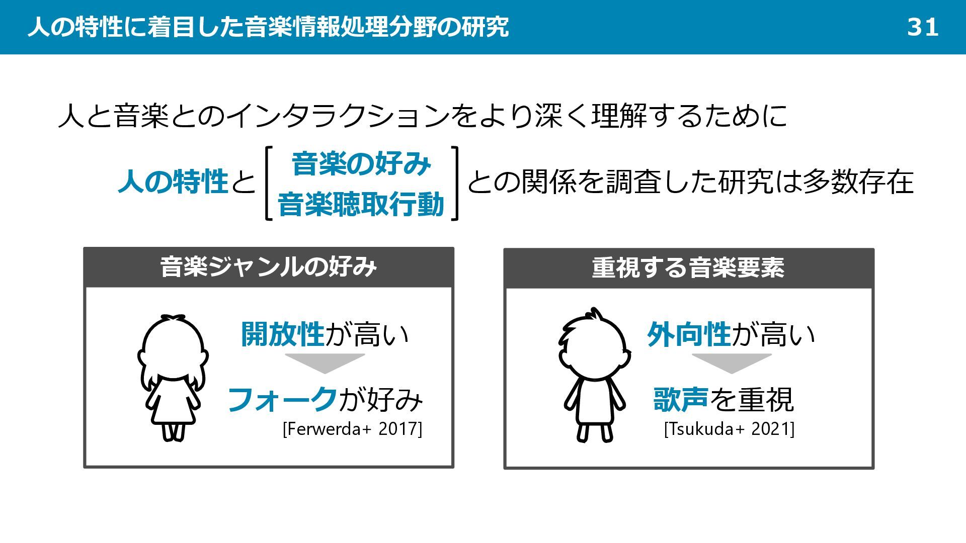 人の特性に着目した音楽情報処理分野の研究 31 開放性が高い フォークが好み [Ferwerda+ 2017] 外向性が高い 歌声を重視 [Tsukuda+ 2021]