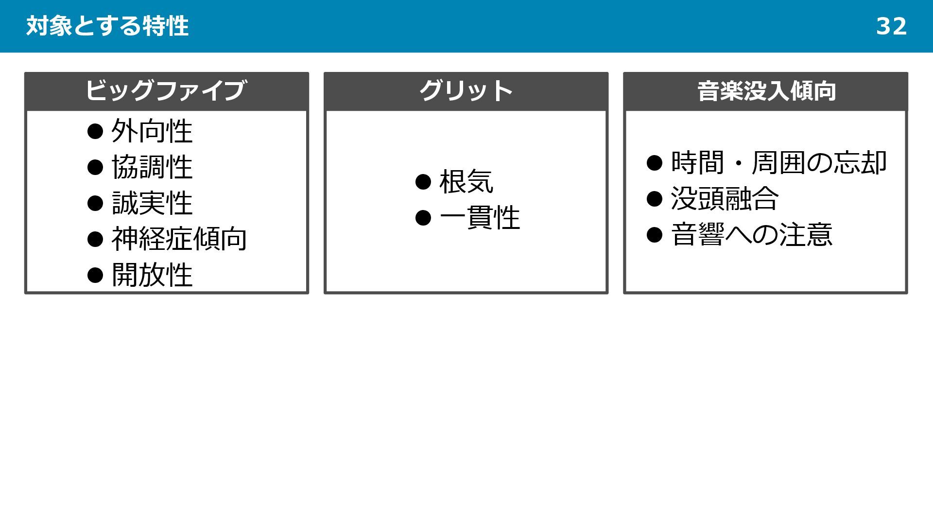 対象とする特性 32 ビッグファイブ グリット 音楽没入傾向 外向性 協調性