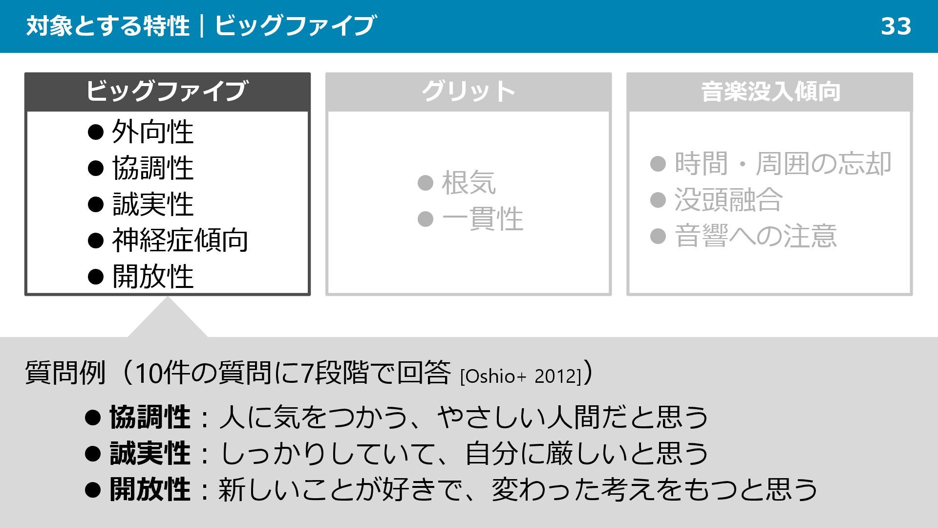 対象とする特性|ビッグファイブ 33 ビッグファイブ グリット 音楽没入傾向 外向性 協調性