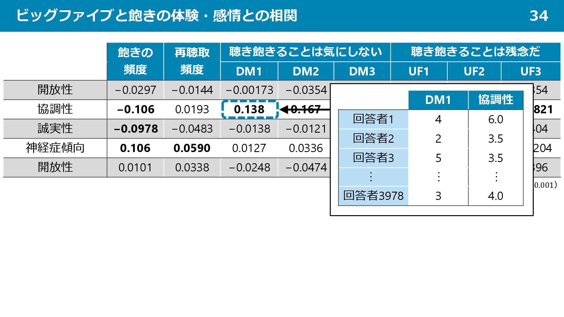 DM2 DM3 UF1 UF2 UF3 開放性 −0.0297 −0.0144 −0.00173 −0.0354 −0.0373 0.00152 0.0182 0.0354 協調性 −0.106 0.0193 0.138 0.167 0.170 −0.0658 −0.0525 −0.0821 誠実性 −0.0978 −0.0483 −0.0138 −0.0121 −0.0109 0.00341 0.0292 0.0404 神経症傾向 0.106 0.0590 0.0127 0.0336 0.0273 0.0274 0.00761 −0.0204 開放性 0.0101 0.0338 −0.0248 −0.0474 −0.0230 0.0182 0.0369 0.0396 ビッグファイブと飽きの体験・感情との相関 34 DM1 協調性 回答者1 4 6.0 回答者2 2 3.5 回答者3 5 3.5 回答者3978 3 4.0 … … …