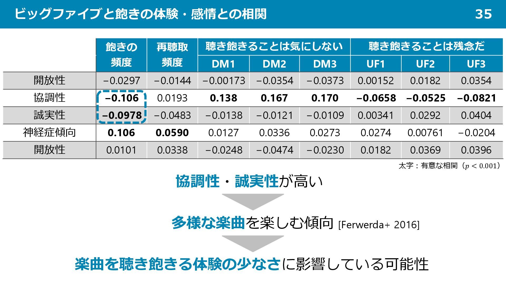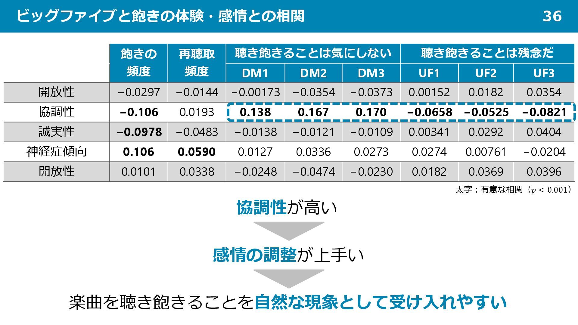 UF2 UF3 開放性 −0.0297 −0.0144 −0.00173 −0.0354 −0.0373 0.00152 0.0182 0.0354 協調性 −0.106 0.0193 0.138 0.167 0.170 −0.0658 −0.0525 −0.0821 誠実性 −0.0978 −0.0483 −0.0138 −0.0121 −0.0109 0.00341 0.0292 0.0404 神経症傾向 0.106 0.0590 0.0127 0.0336 0.0273 0.0274 0.00761 −0.0204 開放性 0.0101 0.0338 −0.0248 −0.0474 −0.0230 0.0182 0.0369 0.0396 ビッグファイブと飽きの体験・感情との相関 36 太字:有意な相関(𝑝𝑝 < 0.001) 協調性が高い 感情の調整が上手い 楽曲を聴き飽きることを自然な現象として受け入れやすい