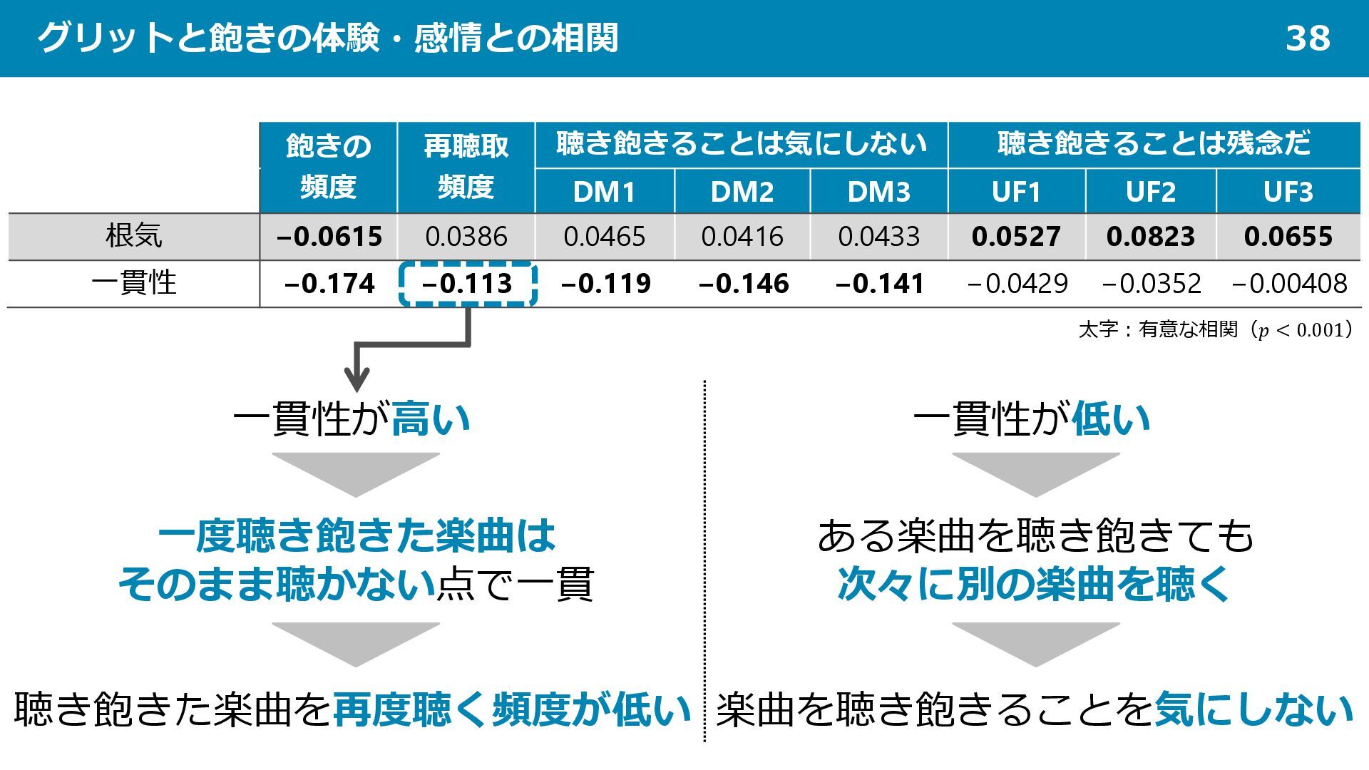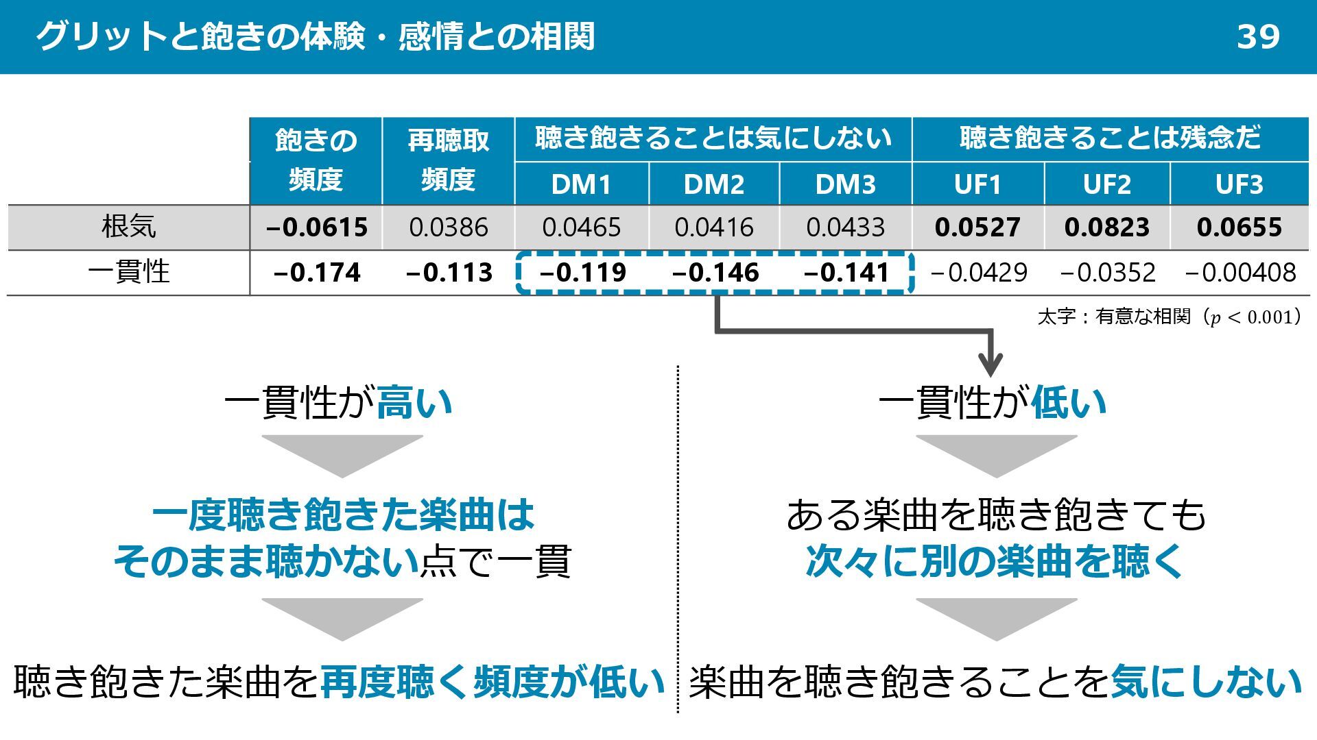 UF2 UF3 根気 −0.0615 0.0386 0.0465 0.0416 0.0433 0.0527 0.0823 0.0655 一貫性 −0.174 −0.113 −0.119 −0.146 −0.141 −0.0429 −0.0352 −0.00408 グリットと飽きの体験・感情との相関 38 太字:有意な相関(𝑝𝑝 < 0.001) 一貫性が高い 一度聴き飽きた楽曲は そのまま聴かない点で一貫 聴き飽きた楽曲を再度聴く頻度が低い 一貫性が低い ある楽曲を聴き飽きても 次々に別の楽曲を聴く 楽曲を聴き飽きることを気にしない
