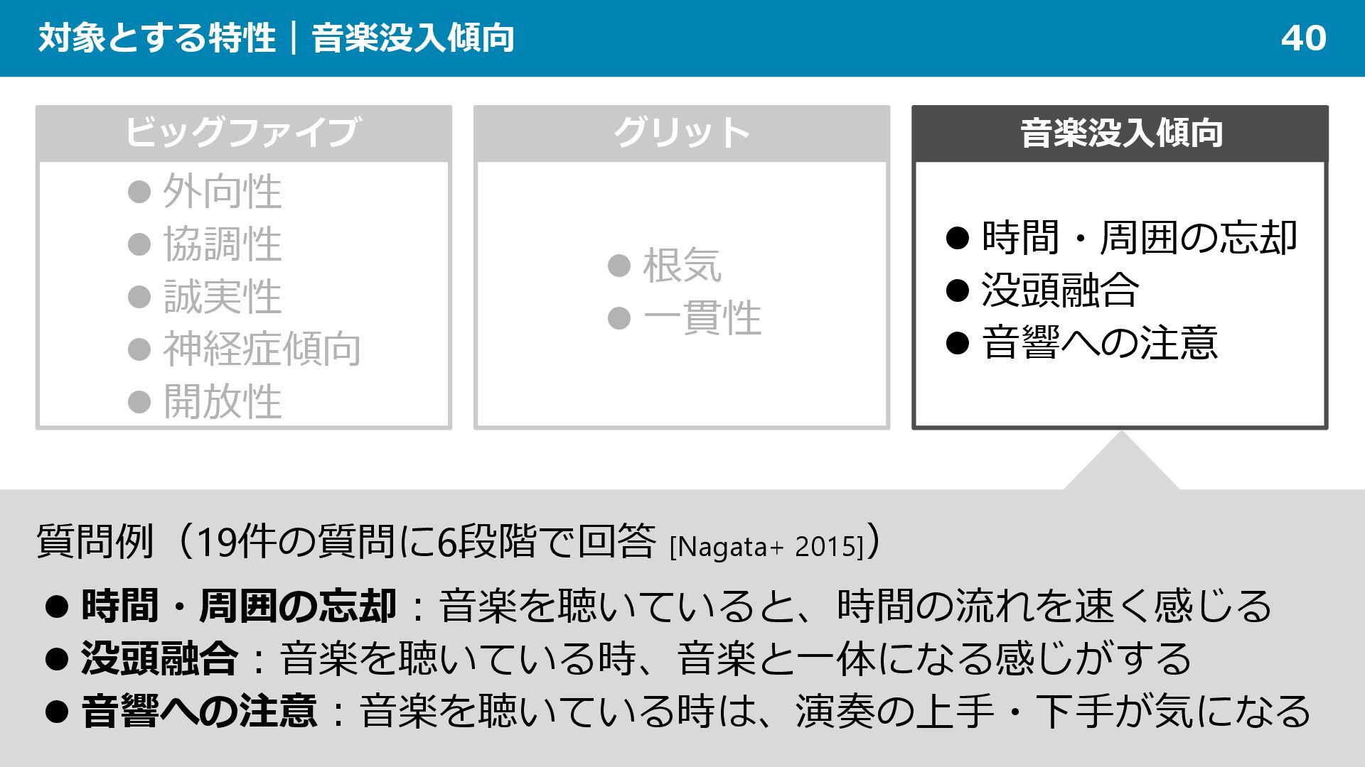誠実性 神経症傾向 開放性 根気 一貫性 時間・周囲の忘却 没頭融合 音響への注意 時間・周囲の忘却:音楽を聴いていると、時間の流れを速く感じる 没頭融合:音楽を聴いている時、音楽と一体になる感じがする 音響への注意:音楽を聴いている時は、演奏の上手・下手が気になる 質問例(19件の質問に6段階で回答 [Nagata+ 2015])