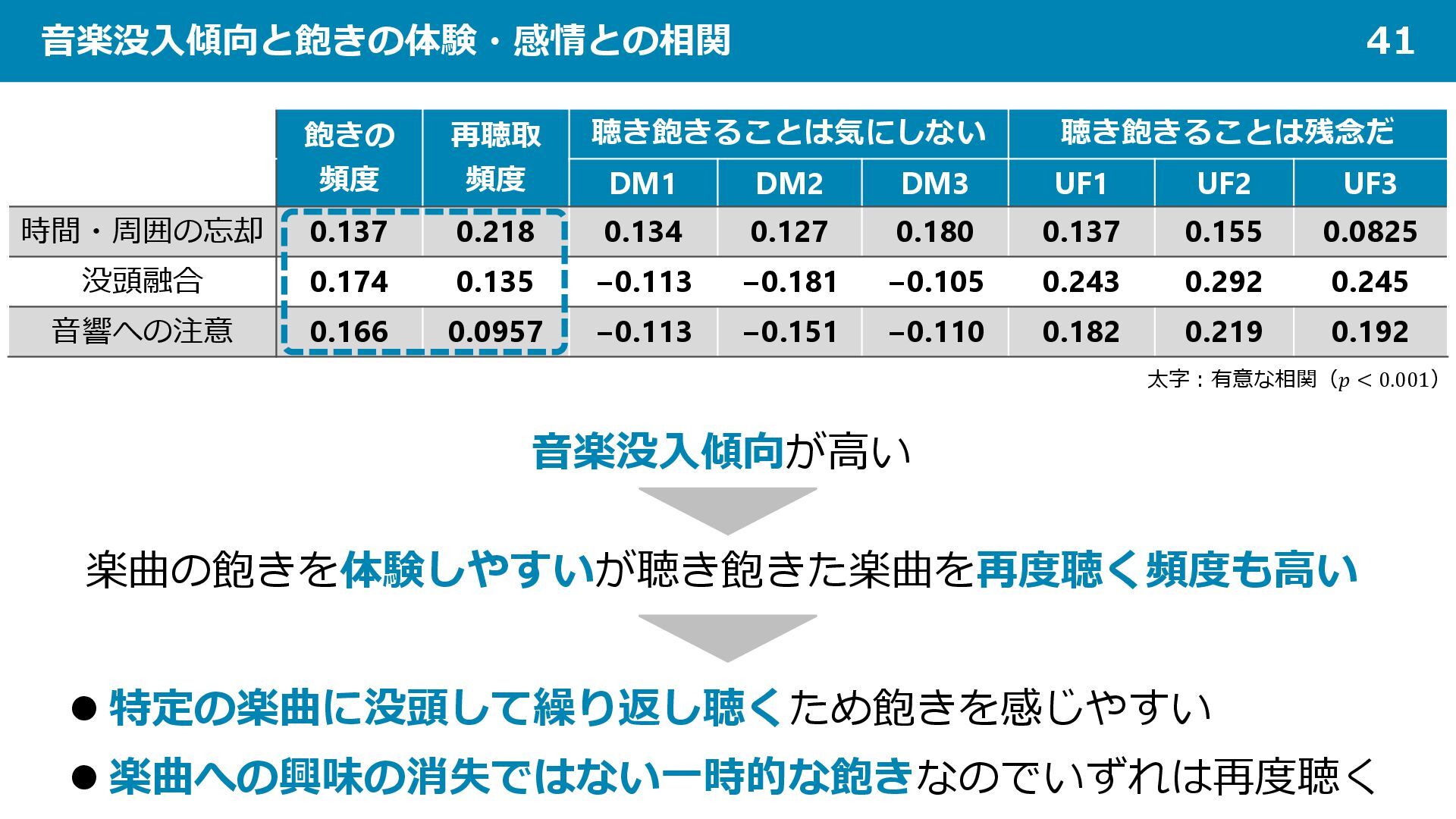 UF2 UF3 時間・周囲の忘却 0.137 0.218 0.134 0.127 0.180 0.137 0.155 0.0825 没頭融合 0.174 0.135 −0.113 −0.181 −0.105 0.243 0.292 0.245 音響への注意 0.166 0.0957 −0.113 −0.151 −0.110 0.182 0.219 0.192 音楽没入傾向と飽きの体験・感情との相関 42 太字:有意な相関(𝑝𝑝 < 0.001) 没頭融合・音響への注意が高い DM (気にしない) が低い UF (残念に思う) が高い 飽きによって楽曲の魅力が下がることを敏感に感じやすく 楽曲を聴き飽きることを残念に思う という結果で全回答者の結果とは逆の傾向