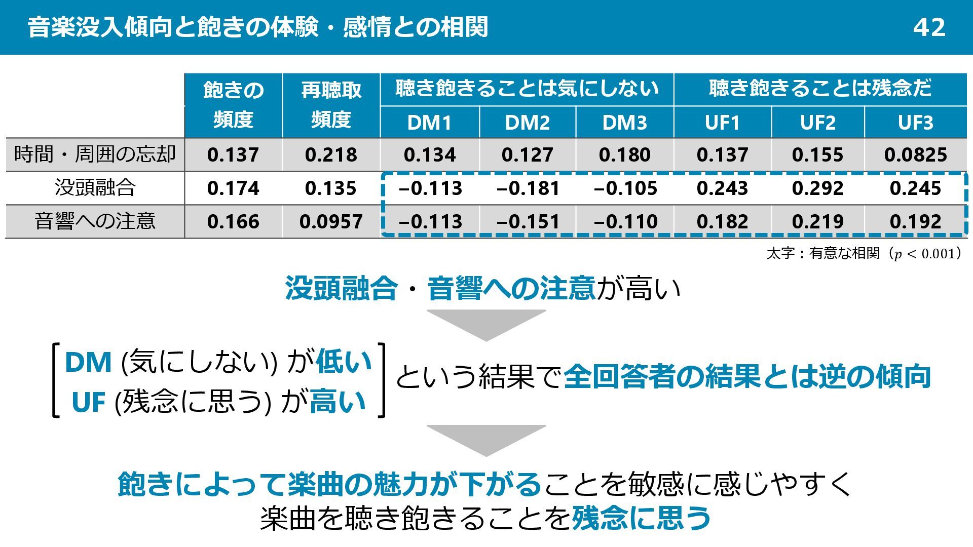 UF2 UF3 時間・周囲の忘却 0.137 0.218 0.134 0.127 0.180 0.137 0.155 0.0825 没頭融合 0.174 0.135 −0.113 −0.181 −0.105 0.243 0.292 0.245 音響への注意 0.166 0.0957 −0.113 −0.151 −0.110 0.182 0.219 0.192 音楽没入傾向と飽きの体験・感情との相関 41 太字:有意な相関(𝑝𝑝 < 0.001) 音楽没入傾向が高い 楽曲の飽きを体験しやすいが聴き飽きた楽曲を再度聴く頻度も高い 特定の楽曲に没頭して繰り返し聴くため飽きを感じやすい 楽曲への興味の消失ではない一時的な飽きなのでいずれは再度聴く