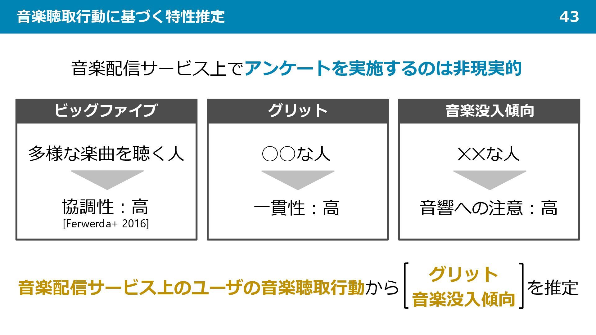 ◯◯な人 音響への注意:高 ✕✕な人 音楽配信サービス上のユーザの音楽聴取行動から を推定 グリット 音楽没入傾向 音楽配信サービス上でアンケートを実施するのは非現実的