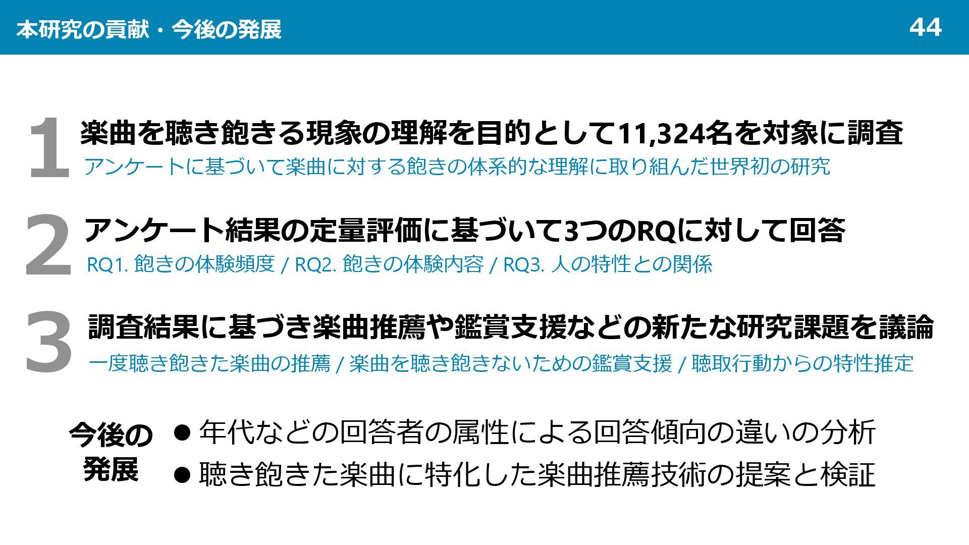 人の特性との関係 1楽曲を聴き飽きる現象の理解を目的として11,324名を対象に調査 アンケートに基づいて楽曲に対する飽きの体系的な理解に取り組んだ世界初の研究 3調査結果に基づき楽曲推薦や鑑賞支援などの新たな研究課題を議論 一度聴き飽きた楽曲の推薦 / 楽曲を聴き飽きないための鑑賞支援 / 聴取行動からの特性推定 今後の 発展 年代などの回答者の属性による回答傾向の違いの分析 聴き飽きた楽曲に特化した楽曲推薦技術の提案と検証