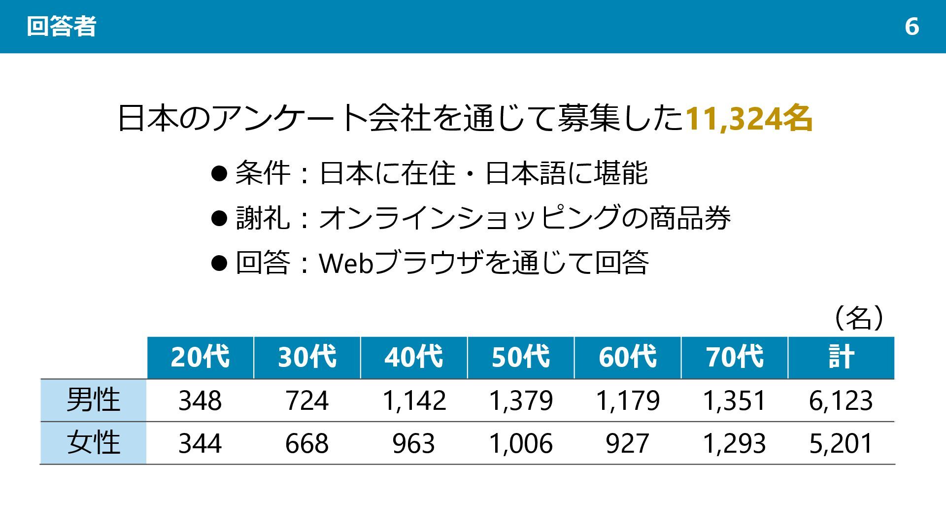 348 724 1,142 1,379 1,179 1,351 6,123 女性 344 668 963 1,006 927 1,293 5,201 (名) 日本のアンケート会社を通じて募集した11,324名 条件:日本に在住・日本語に堪能 謝礼:オンラインショッピングの商品券 回答:Webブラウザを通じて回答