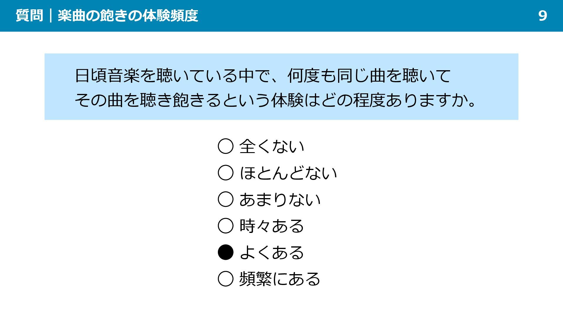 質問|楽曲の飽きの体験頻度 9 日頃音楽を聴いている中で、何度も同じ曲を聴いて その曲を聴き飽きるという体験はどの程度ありますか。 全くない ほとんどない あまりない 時々ある よくある 頻繁にある