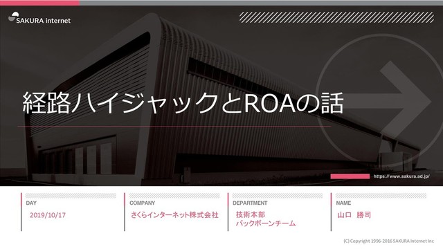 経路ハイジャックとROAの話 2019/10/17 (C) Copyright 1996-2016 SAKURA Internet Inc さくらインターネット株式会社 技術本部