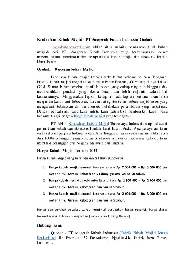 ubah Indonesi a Q oobah hargakubahena m el.com adalah situs w ebsite pe m asaran (jual kubah masjid) dari PT . A nugerah K ubah Indonesia yang berkonsentrasi dala m merencanakan, m endesain dan m e m produksi kubah m asjid dan aksesoris ibadah Umat Islam . Qoobah – Produsen Kubah M asji d Produsen kubah m asjid terbai k terbai k dan terbesar se- A sia Tenggara. Produk kubah m asjid unggulan ka m i yaitu bahan Ena m el, G al val um , dan St ai nless Gol d. Se m ua bahan tersebut m e m iliki bobot yang cukup ringan, sehi ngga tidak me mbut uhkan pondasi yang ekstra kuat, dan lebi h terjam i n dala m hal kea m anannya. M enggunakan lapisan kedap air pada lapisan pertam a, akan lebi h menj a m i n kubah dari kebocoran, karena sering kita tem ui kubah m asjid beton yang mengala m i kebocoran dan sulit unt uk m elakukan pena m balan yang m aksi m al. Dengan pengalam an yang ka m i m iliki, ka m i yakin bisa m e m berikan kubah yang ber m ut u tinggi dengan harga kubah m asjid yang terjangkau. PT AK I - K ontrakt or K ubah M asjid Terpercaya Indonesia siap m el ayani per m i ntaan kubah dan aksesoris Ibadah Um at Isla m Anda. A rea pelayanan ka m i yaitu seluruh penj uru Indonesia dan A sia Tenggara. K a m i sekarang m e m iliki lebi h dari 1000+ pelanggan yang tersebar di seluruh w ilayah di Indonesia. B ahkan, ka m i me m iliki pelanggan dari Negara M alaysia dan Filipi na. Harga K ubah M asji d Terbaru 2022 Harga kubah m asji d yang ka m i berikan di tahun 2022 yaitu: 1. Harga kubah m asji d enamel berkisar antara Rp. 2.500. 000 – Rp. 3. 500. 000 per met er / m 2. Garansi kebocoran 5 tahun, garansi w arna 20 tahun. 2. Harga kubah m asji d gal valum berkisar antara Rp. 1. 500. 000 – Rp. 2.000. 000 per met er / m 2. Garansi kebocoran dan w arna 5 tahun. 3. Harga kubah m asji d enamel berkisar antara Rp. 2.000. 000 – Rp. 3. 000. 000 per met er / m 2. Garansi kebocoran dan w arna 5 tahun. Harga bisa berubah sewaktu- w aktu m engi kuti perubahan harga m ateri al. Harga di atas bel um ter m asuk bi aya transportasi (Barang dan Tukang Pasang) Hubungi kam i. Qoobah - PT Anugerah Kubah Indonesia (Pabrik K ubah M asjid M urah Berkualitas) Jln Pra m uka 157 Pur wokerto, N gadiluw i h, K ediri, Jaw a T i m ur, Indonesia.