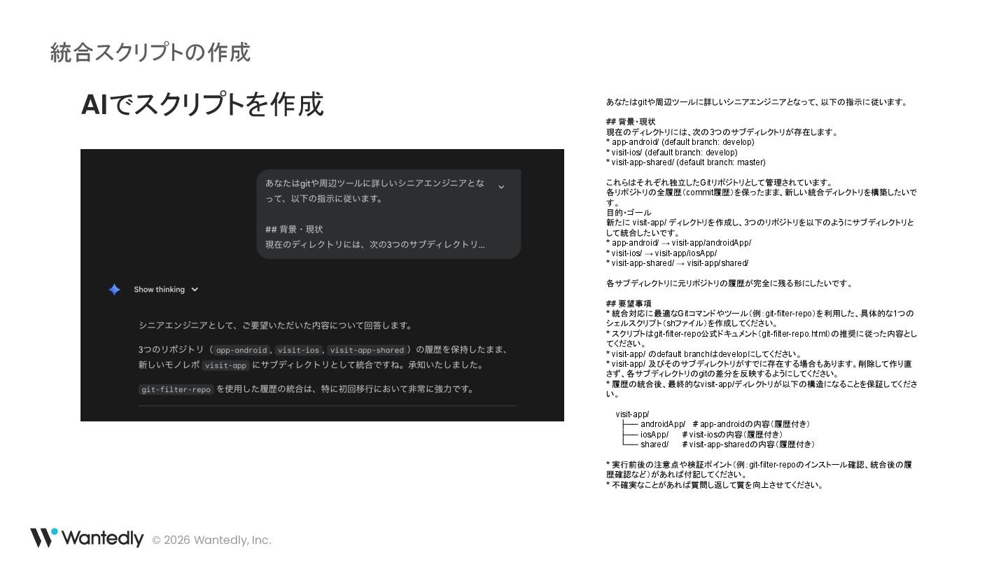 * app-android/ (default branch: develop) * visit-ios/ (default branch: develop) * visit-app-shared/ (default branch: master) これらはそれぞれ独立したGitリポジトリとして管理されています。 各リポジトリの全履歴(commit履歴)を保ったまま、新しい統合ディレクトリを構築したいで す。 目的・ゴール 新たに visit-app/ ディレクトリを作成し、3つのリポジトリを以下のようにサブディレクトリと して統合したいです。 * app-android/ → visit-app/androidApp/ * visit-ios/ → visit-app/iosApp/ * visit-app-shared/ → visit-app/shared/ 各サブディレクトリに元リポジトリの履歴が完全に残る形にしたいです。 ## 要望事項 * 統合対応に最適なGitコマンドやツール(例:git-filter-repo)を利用した、具体的な1つの シェルスクリプト(shファイル)を作成してください。 * スクリプトはgit-filter-repo公式ドキュメント(git-filter-repo.html)の推奨に従った内容とし てください。 * visit-app/ のdefault branchはdevelopにしてください。 * visit-app/ 及びそのサブディレクトリがすでに存在する場合もあります。削除して作り直 さず、各サブディレクトリのgitの差分を反映するようにしてください。 * 履歴の統合後、最終的なvisit-app/ディレクトリが以下の構造になることを保証してくださ い。 visit-app/ ├── androidApp/ # app-androidの内容(履歴付き) ├── iosApp/ # visit-iosの内容(履歴付き) └── shared/ # visit-app-sharedの内容(履歴付き) * 実行前後の注意点や検証ポイント(例:git-filter-repoのインストール確認、統合後の履 歴確認など)があれば付記してください。 * 不確実なことがあれば質問し返して質を向上させてください。