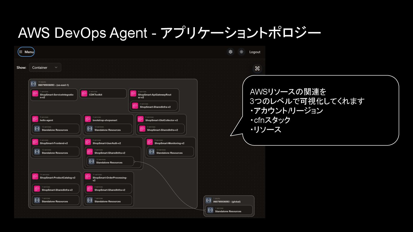 AWS DevOps Agent - アプリケーショントポロジー AWSリソースの関連を 3つのレベルで可視化してくれます ・アカウント/リージョン ・cfnスタック ・リソース